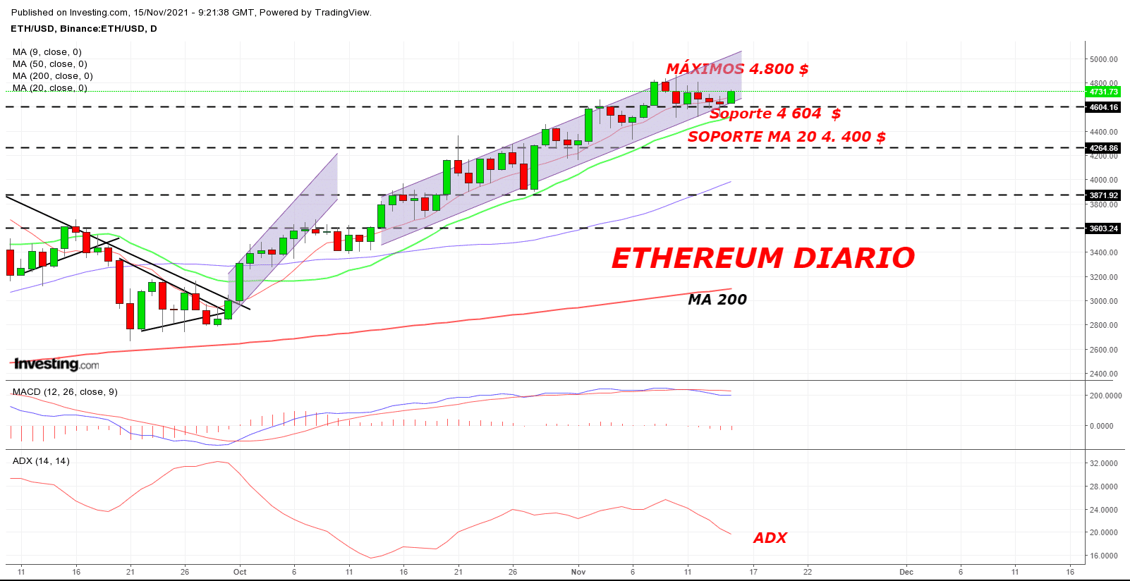 El Ethereum, mantiene el canal alcista – no está en tendencia (ADX 20) – y rebota en el Soporte. Recorrido alcista a primera Resistencia 4. 700 / 4. 800 $ y resistencia mayor en zona alta de canal que supondría nuevos máximos en 5.000 $.