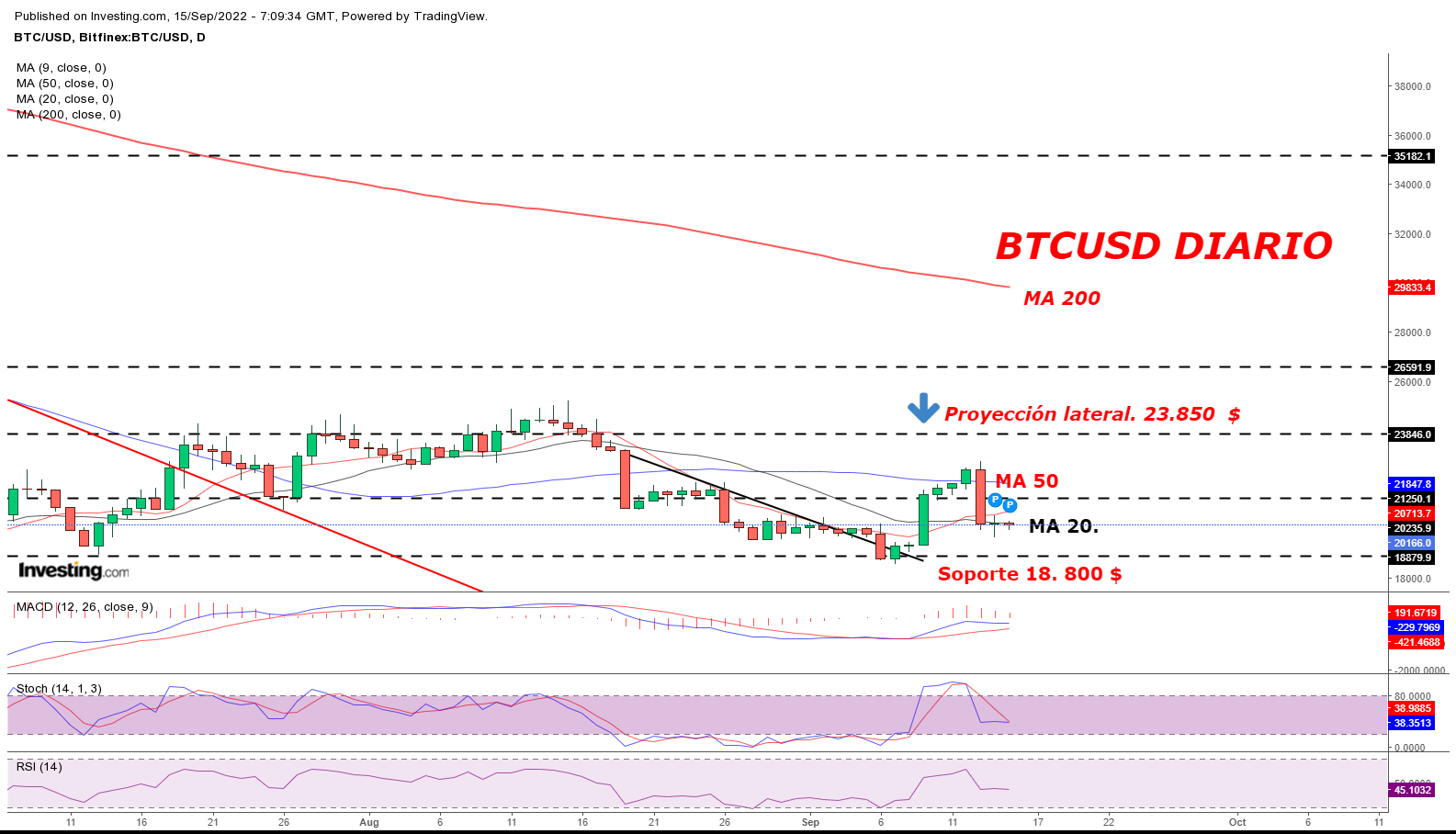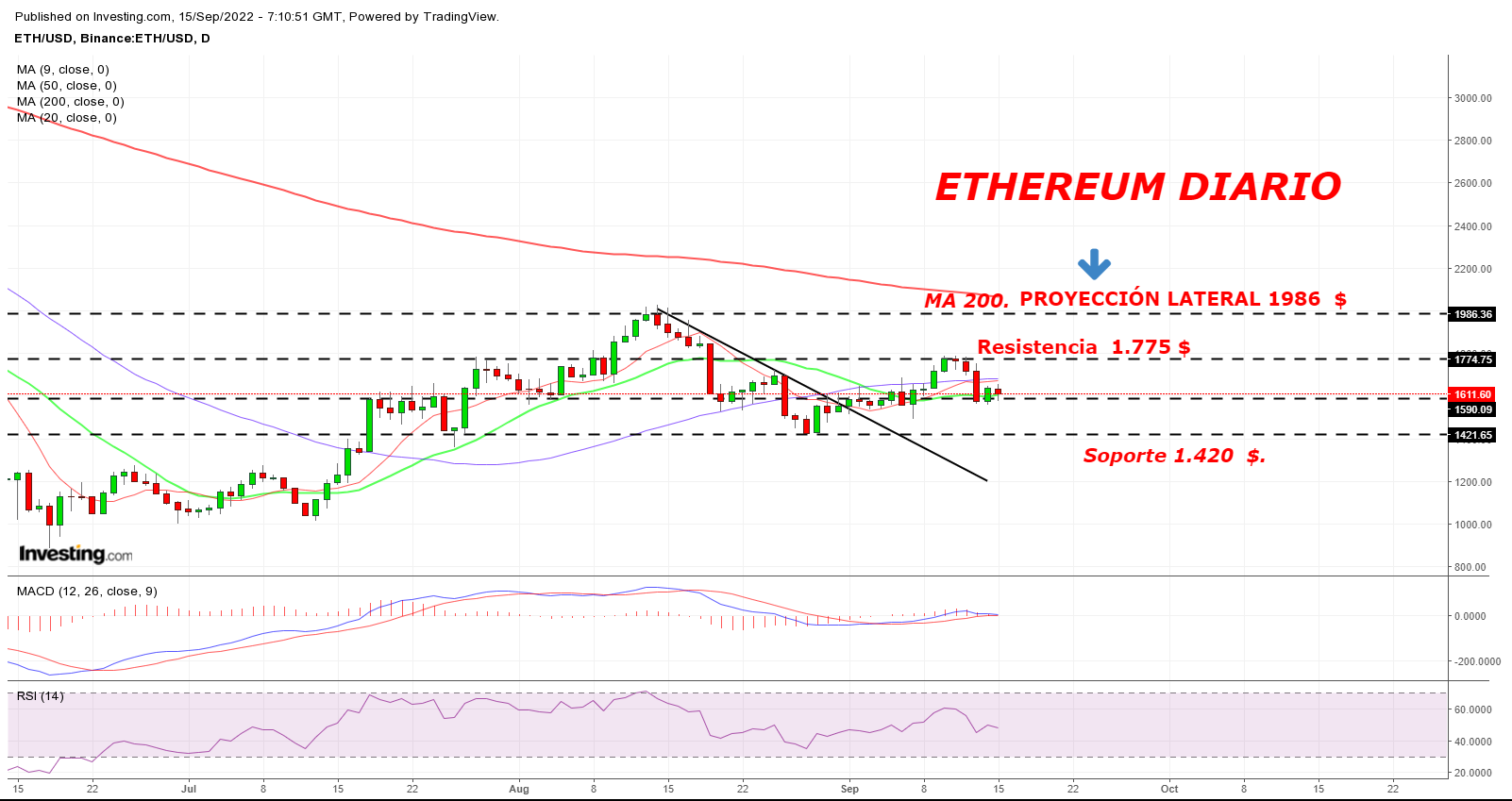 El Bitcoin presenta un Doji mínimo por encima de la MA 20 Sesiones. A día de ayer, salvó el soporte ( ver vídeo ayer Bitcoin ) gracias a su correlación con NASDAQ. La tasa de hash cae de nuevo y abandona niveles de máximos históricos. Ethereum cae pero aguanta mejor, por ahora, soporte MA 20