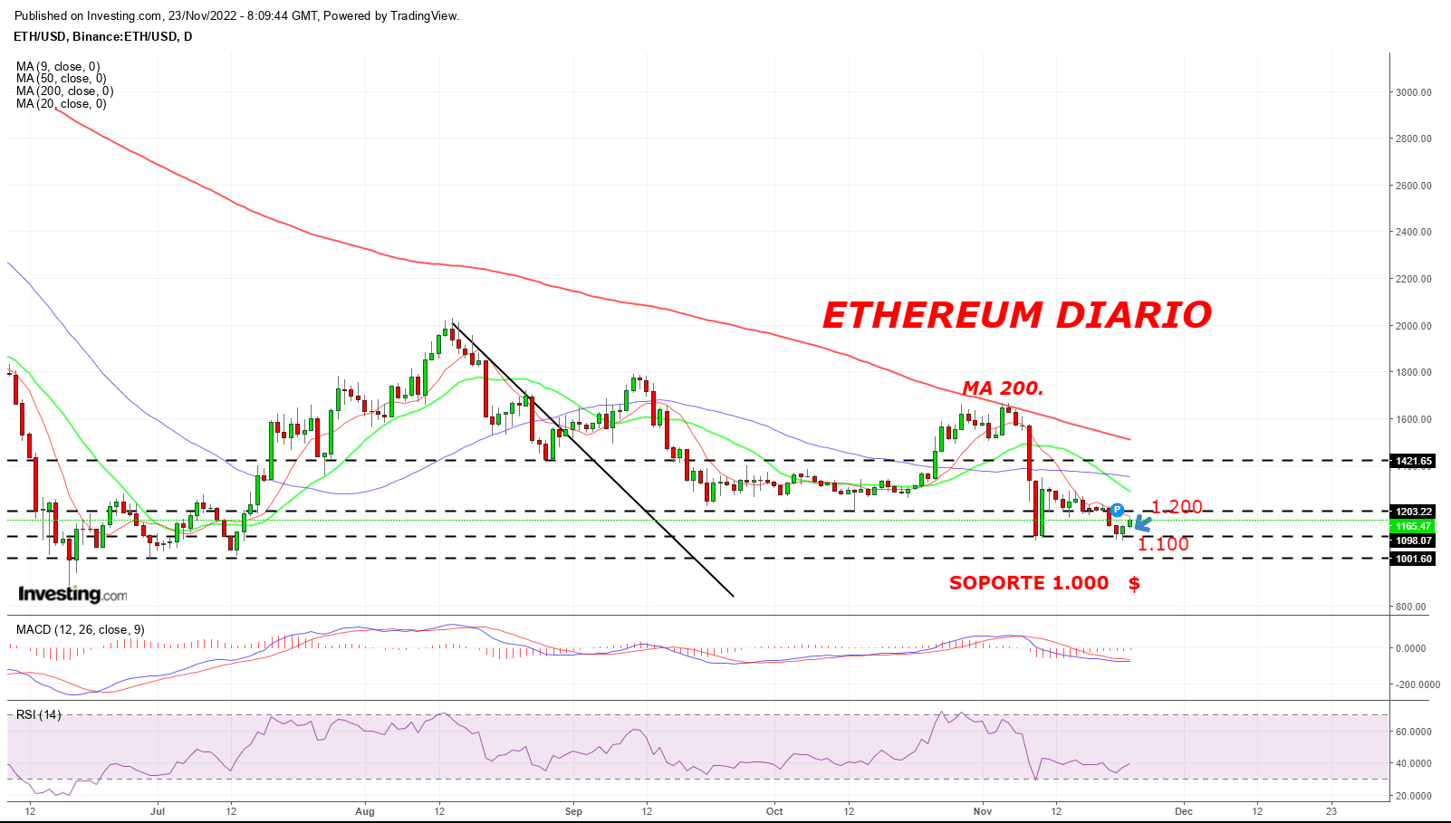 Ethereum rebota en 1.100 $. Resistencia 1.200$