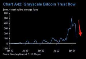 Como vemos en el chart de arriba, los flujos de BTC del Dealer Grayscale cayeron de forma rápida casi a la vez que el BTC comenzaba su recorte. ¿Ya no querían comprar más?