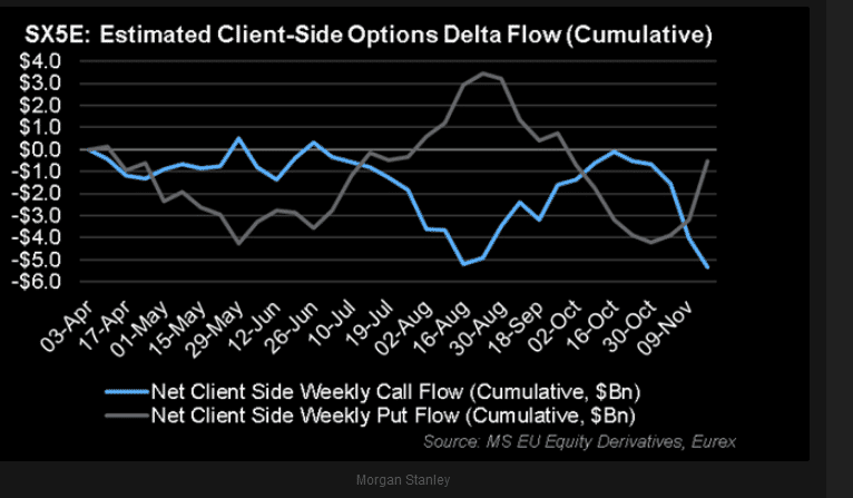 Siguiente gráfico observamos como en Europa caen las Calls -opciones alcistas – en la misma medida en que suben las posiciones particulares de las Puts -opciones bajistas –