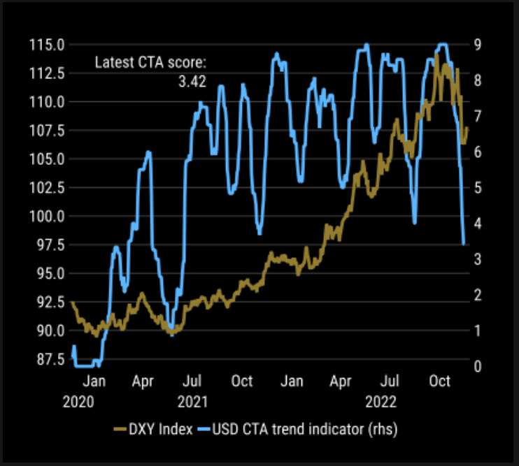 Tras las vacaciones de Acción de Gracias, el Mercado se presenta ahora más temeroso como indican las posiciones cortas de Puts y las subidas de posiciones cortas en acciones individuales en Europa. Por otro lado, en EEUU, destaca el open interest de cortos por parte de los CTA ‘s ( mano fuerte táctica similar a los Hedge Funds) ¿Objetivo Dollar Index MA 200?