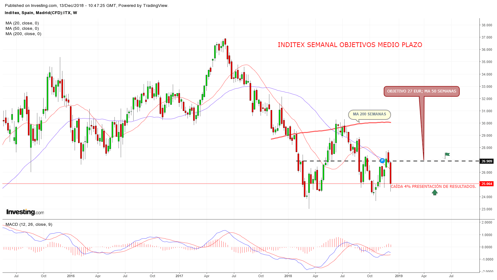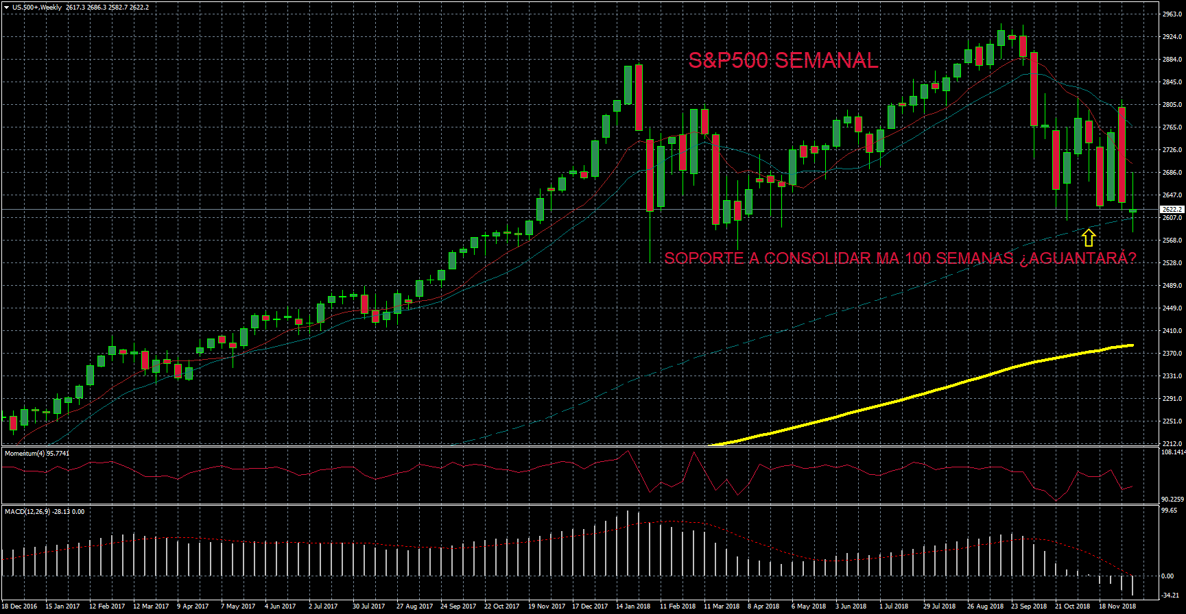 Por parte de la referencia de mercado, S&P500, ha consolidado un nuevo soporte en los 2600 puntos, que, dada la volatilidad que existe, podría ser atacado en la próxima semana o, por el contrario, consolidarse en 2650. Por el momento, el entorno de los 2600 nos coincide con el soporte de MA de 100 Semanas. Aunque, a falta de la sesión de hoy viernes, el MACD no presenta una lectura muy prometedora para los alcistas.