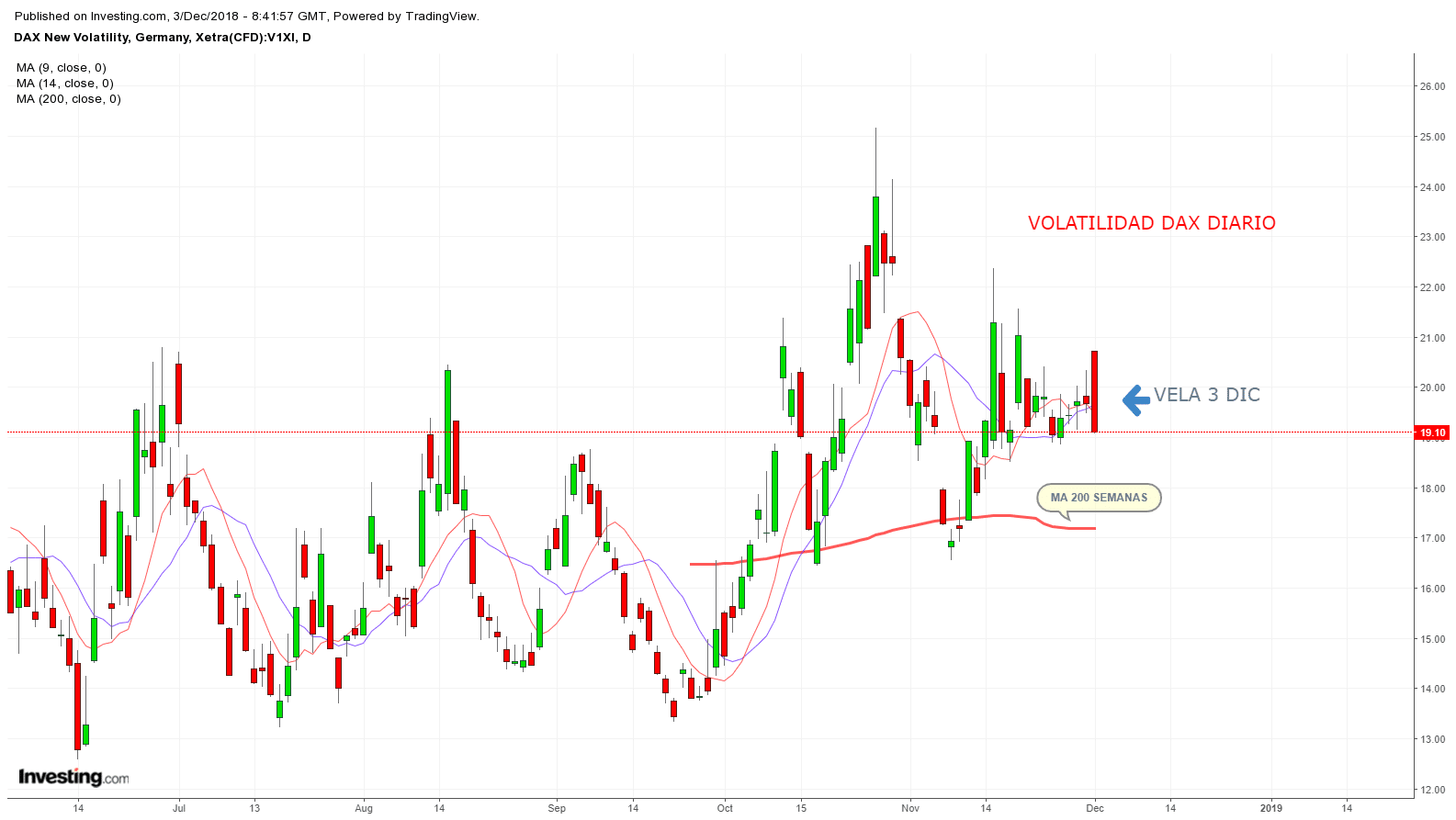 El DAX alemán, continua con el patrón bajista – falta de liquidez – de isla de inversión en el gráfico diario. Son ya tres las que ha consolidado sin poder cerrar los huecos. Por lo tanto, de cumplirse el patrón como las semanas anteriores, no descartamos otro rally bajista en el selectivo alemán para la semana que viene. Aunque la volatilidad de mercado del DAX lleva tres sesiones consecutivas a la baja, dada la situación de incertidumbre en Europa, podría remontar en cualquier momento.