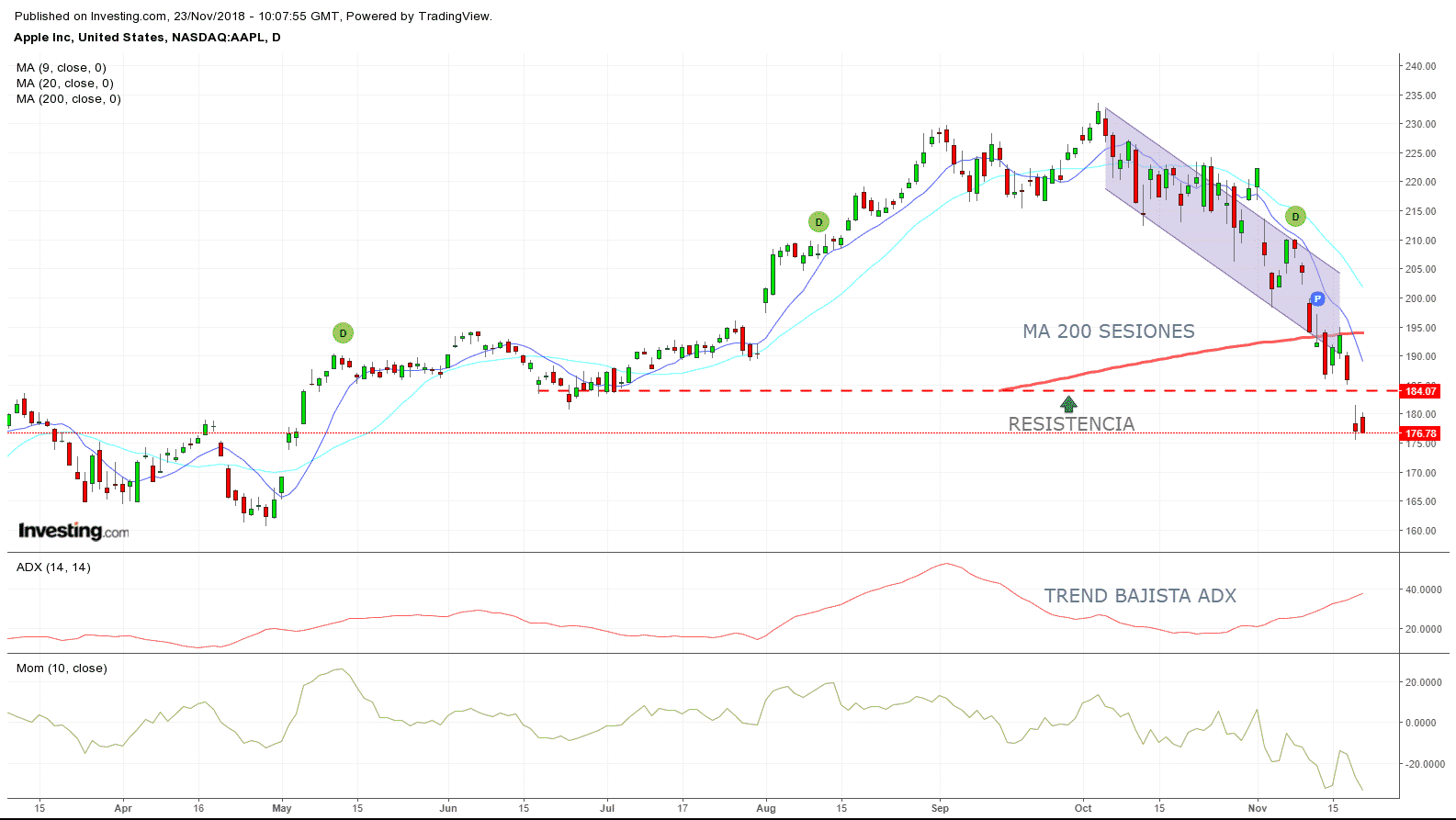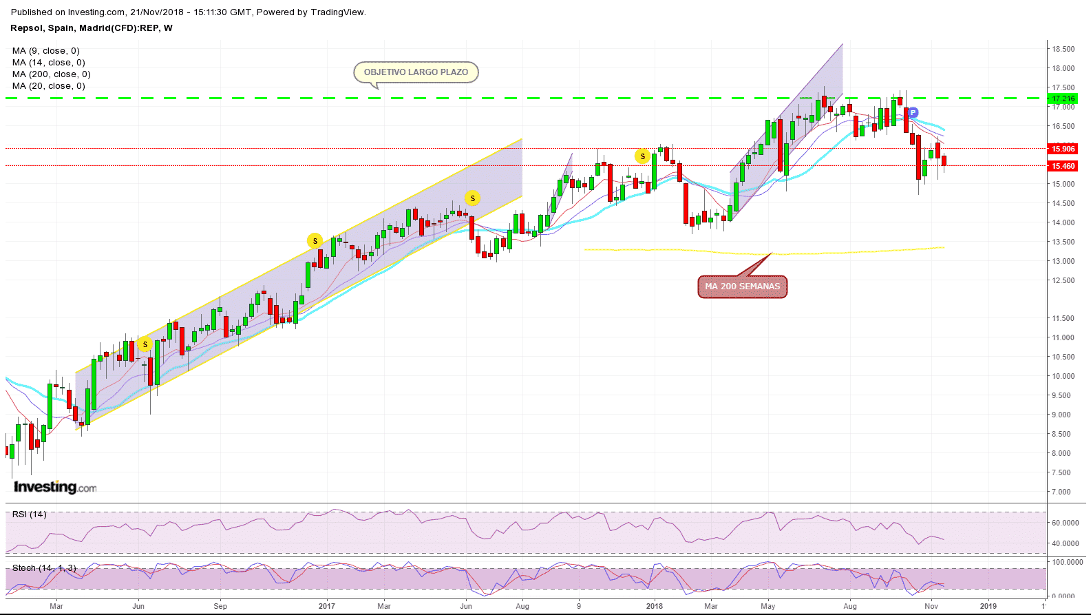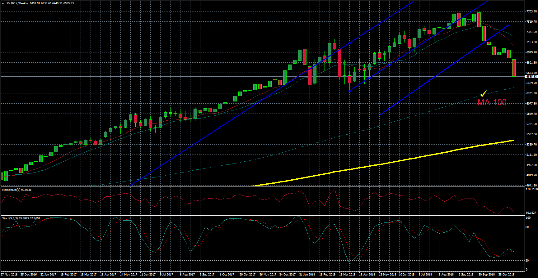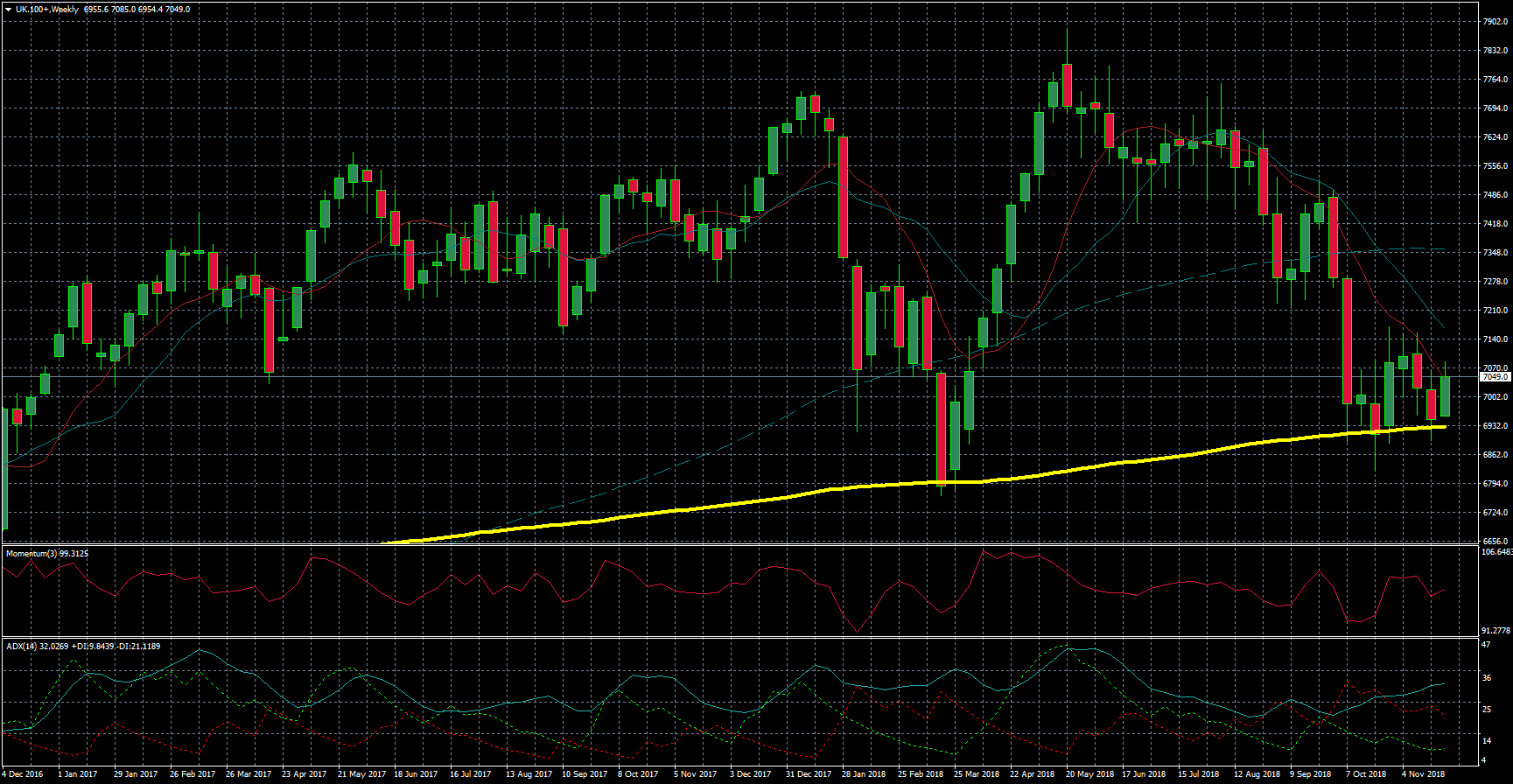 Índice británico UK 100 (FTSE) semanal. Tras la caída provocada por la propuesta de May en el Parlamento, el selectivo británico descansa sobre un soporte (MA 200) peligroso.