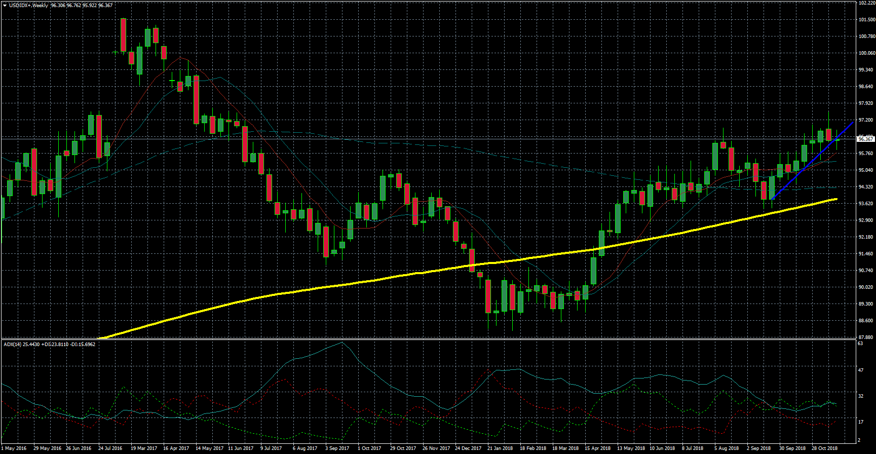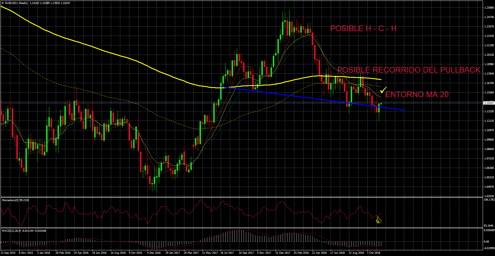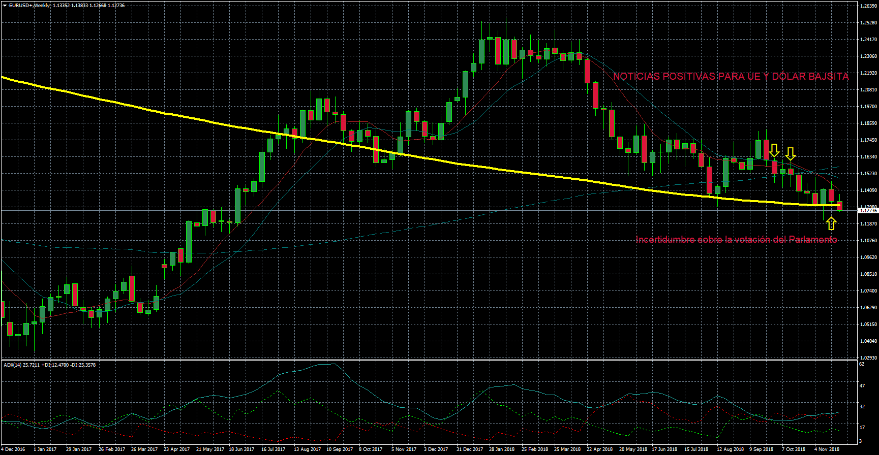 Como se puede apreciar en el gráfico superior, en octubre coincidió cierta relajación del dólar en su presión alcista. Esto combinado con la percepción de un acuerdo sobre BREXIT llevó al EURUSD a máximos de su rango en el medio plazo. A partir de noviembre – presión alcista del dólar y crisis del acuerdo sobre BREXIT – se activa la directriz bajista que pone en peligro el soporte MA 200 semanas del EURUSD.