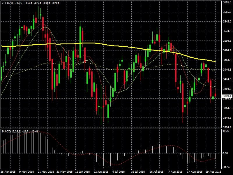 Teniendo en cuenta la situación actual de volatilidad con sesgo bajista provocada por el conflicto de los aranceles con EEUU y las malas noticias macro de Alemania ( hoy 03/09/2018 el índice de manufacturas ha caído 1 pto. ) convendría tener presente el análisis técnico del Stoxx50 y acompasarlo con nuestras previsiones de trading en el DAX.