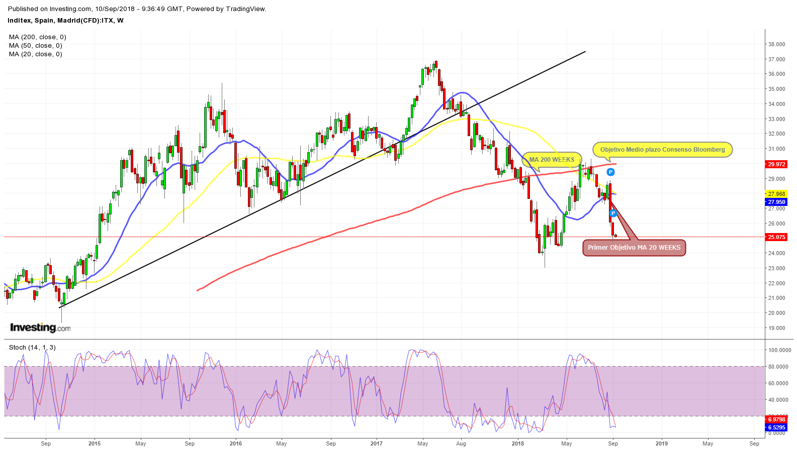 A la espera de los resultados, aparecen dos consensos, según Bloomberg. El primero hace referencia a que los resultados de ventas se van a estabilizar a la baja en los próximos meses y años. El segundo consenso, derivado del anterior, afirma que INDITEX es ahora una compañía para el medio / largo plazo y, dentro de este horizonte temporal, podría volver a cotizar en el entorno de los 31 Euros por acción. Actualmente ( 10/09/2018) cotiza a 25’08 Eur Acción.