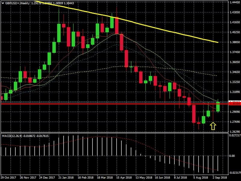 Chart semanal GBP/USD.MACD Flecha indica doji semana de incertidumbre sobre tipos GB y continuidad del Gobernador del Banco de Inglaterra
