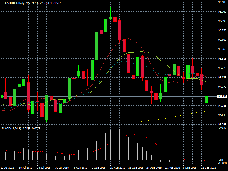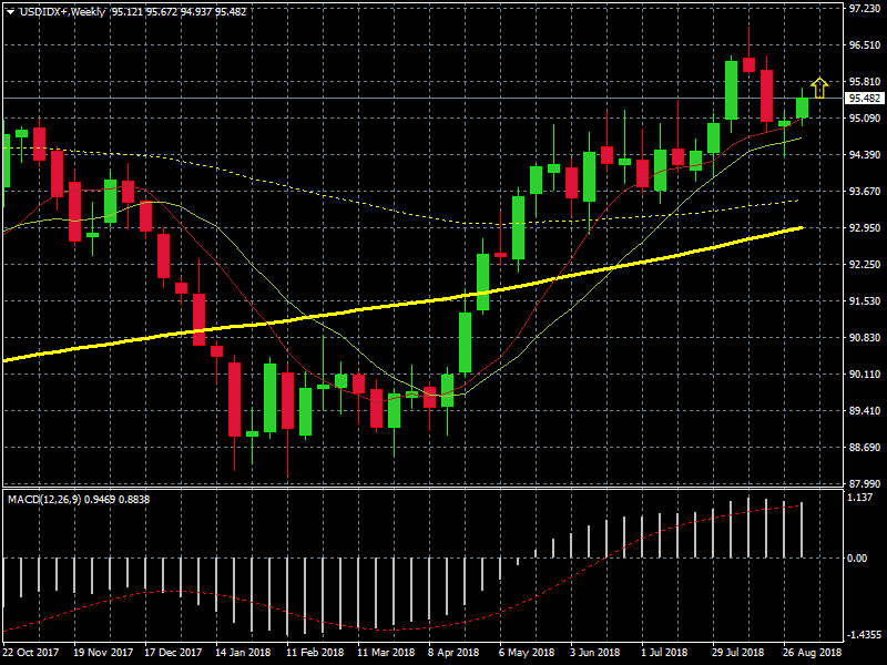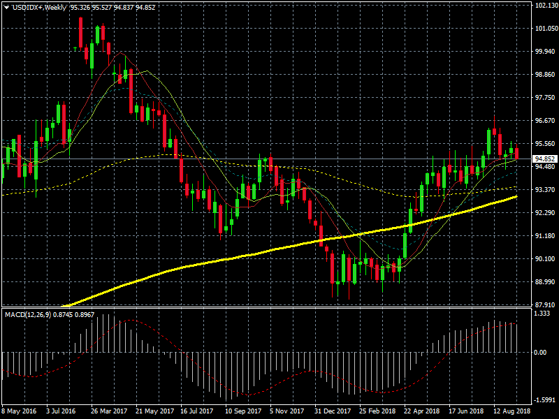 Chart Índice Dólar resistencia en el entorno de 95. Con Medias móviles exponenciales ( 9,14, 100 y 200 periodos )