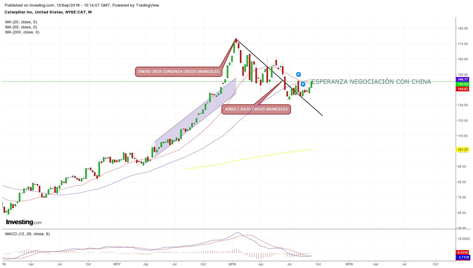 Dos meses más tarde y tras semanas de volatilidad en los índices USA, que dejaron atrás al Dow Jones ( el único major index USA que se ha quedado fuera de máximos históricos ), nos encontramos en el chart semanal de Caterpillar una recuperación de dos velas semanales cuya explicación todavía no tiene consenso entre los analistas.