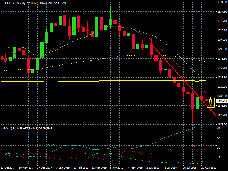 Como puede verse en el gráfico superior, de medio plazo, la vela de esta semana tiene dos días para testar e intentar quebrar el soporte formado por la trend bajista. Por ello, en el caso de encontrarnos con una apertura semanal el lunes 10 de septiembre, por debajo de los 1.1180 $ la onza , el oro podría ir a buscar mínimos de Noviembre de 2016.