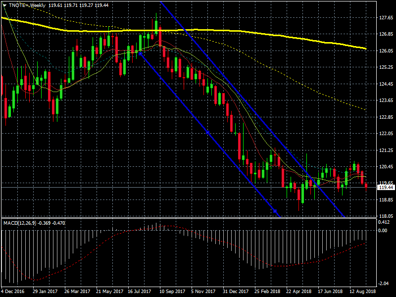 Chart TNOTE pool de Bonos USA con los que se puede operar. La subida de interés de dichos bonos provocó la caída de los precios. MACD indica la pérdida de momentum de la caída del precio