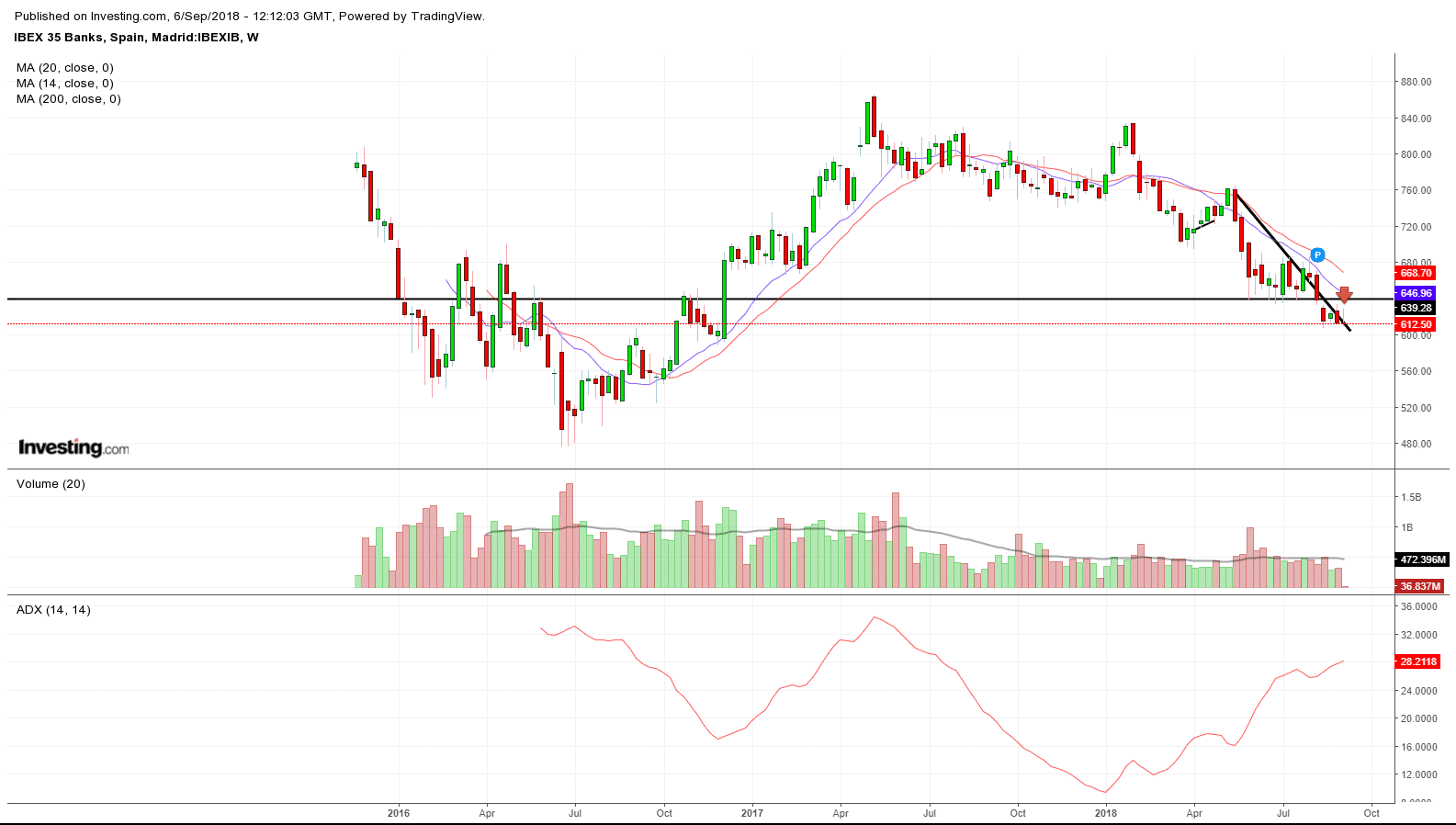 Además de contar con los indicadores y osciladores habituales para seguir la tendencia bajista iniciada en el Ibex, contamos también con el análisis técnico del chart del IBEX BANKS, un subíndice del selectivo español que agrupa a la banca española y que suele ser un buen indicador del sesgo del selectivo español.