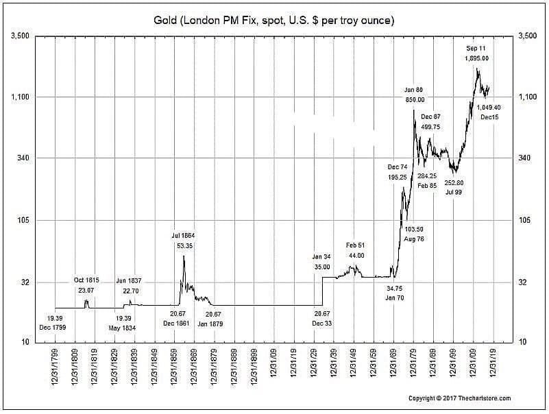 Curiosidad histórica: Gráfico logarítmico de la cotización del oro desde 1799 (Fuente Techchartstore.com )
