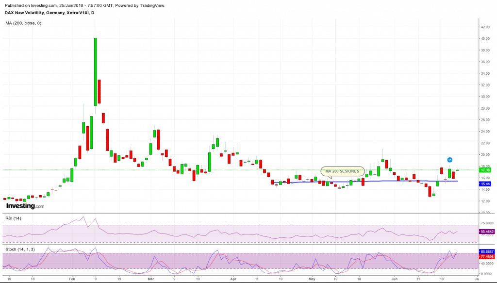 Esto no quiere decir en absoluto que no tengamos sesiones al alza. Pero hoy mismo ( Lunes , 25 Junio ), por ejemplo, el selectivo alemán ha perdido más de 100 puntos en 45 ‘min. No obstante, la volatilidad se va a mover por lo que es conveniente ; por lo menos la primera parte de la semana, atenerse a movimientos direccionales claros tomando como guía la volatilidad del DAX. Índice V1XI.