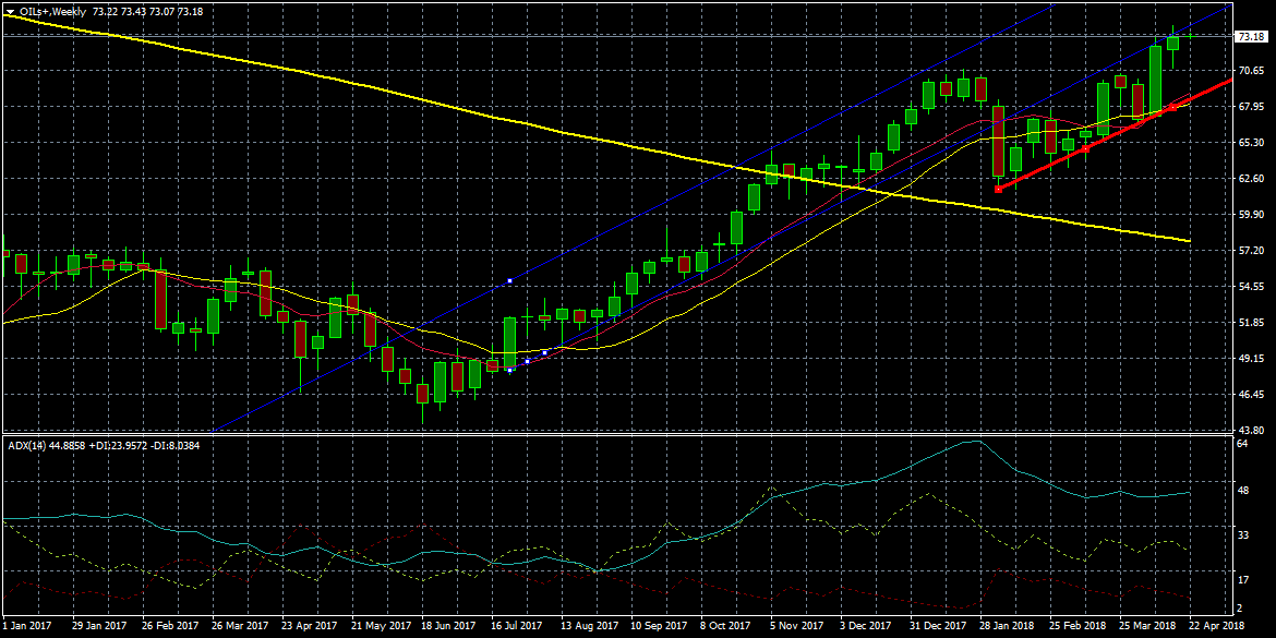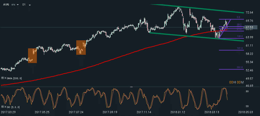 En el corto plazo Agilent Technologies está en tendencia alcista, podemos ver dos gaps alcistas señalados en color naranja en el 23 de mayo del 2017 y 16 de agosto del 2017, los cuales podrían ser gaps de ruptura o de escape para continuar con la tendencia alcista de fondo.