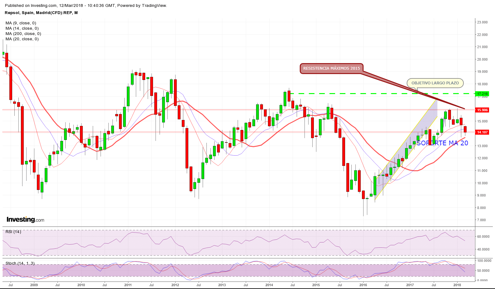 La media móvil de 200 sesiones marcada en color roja se está girando al alza y podría actuar cómo zona de soporte relevante en el futuro.
