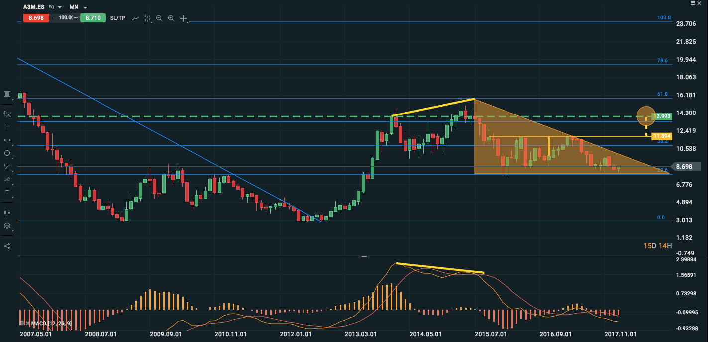 A3M está dentro de un triángulo en un movimiento lateral con un soporte consistente en el 23,6 de Fibonacci (7,83€/acción). Dentro del triángulo tendríamos una taza con asa que nos marcaría un precio de salida en 13,993€/acción. El valor venía en clara tendencia alcista hasta el 01/01/14 que empezó un cambio de tendencia donde se observa una divergencia con el MACD (señalada en amarillo).