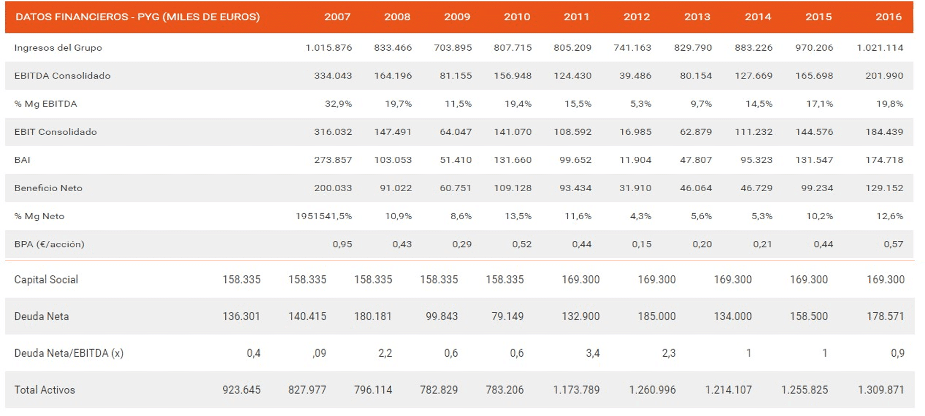 Los datos de fundamentales se recogen en las siguientes tablas: