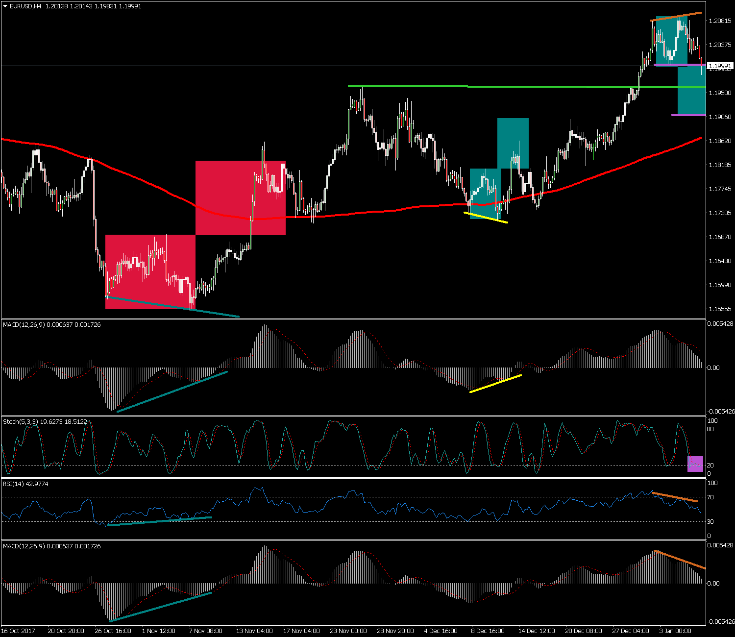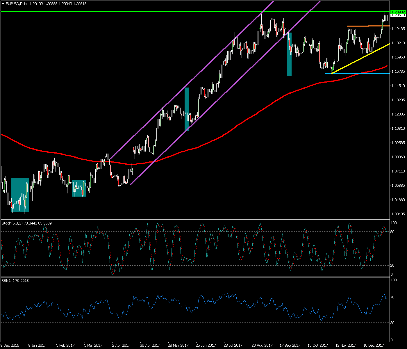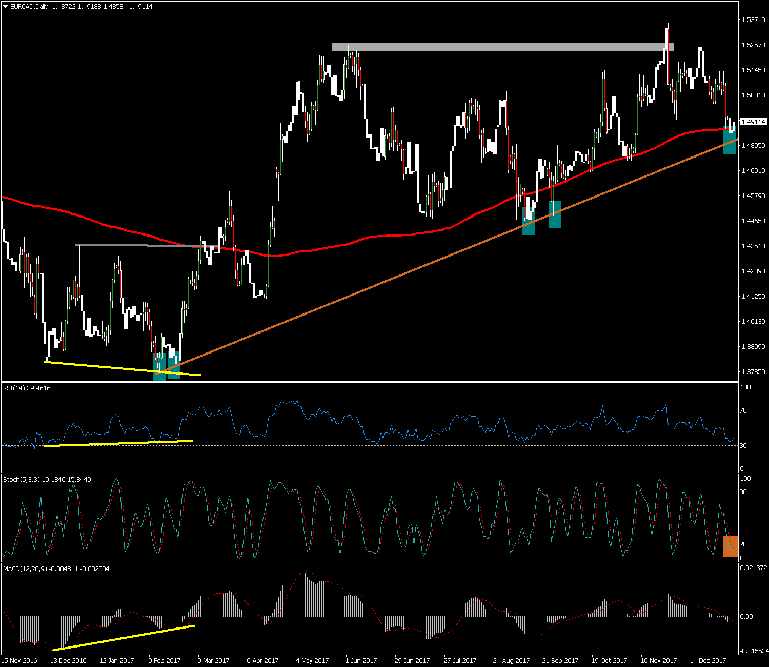 En la sesión de ayer martes 9 de enero del 2018 el EUR/CAD acabó formando una vela de señal tipo martillo señalada en azul justo en la directriz alcista principal indicando cierto soporte en los mínimos de la vela en la zona de los 1.4800.