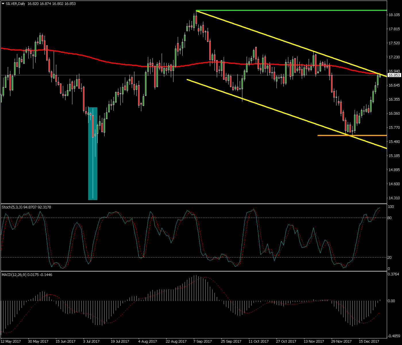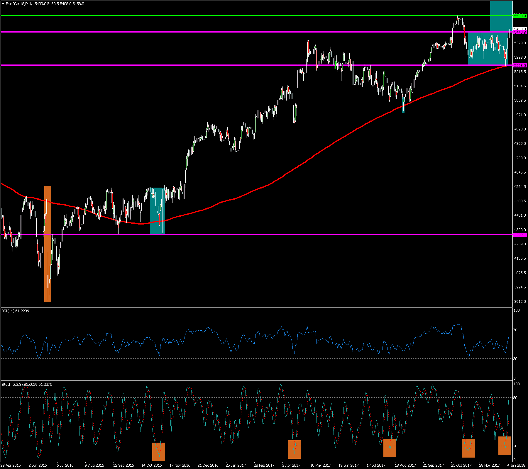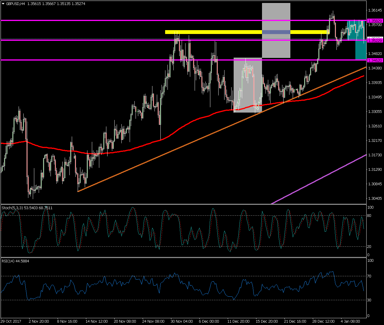 En la sesión de ayer martes 9 de enero del 2018 el EUR/CAD acabó formando una vela de señal tipo martillo señalada en azul justo en la directriz alcista principal indicando cierto soporte en los mínimos de la vela en la zona de los 1.4800.