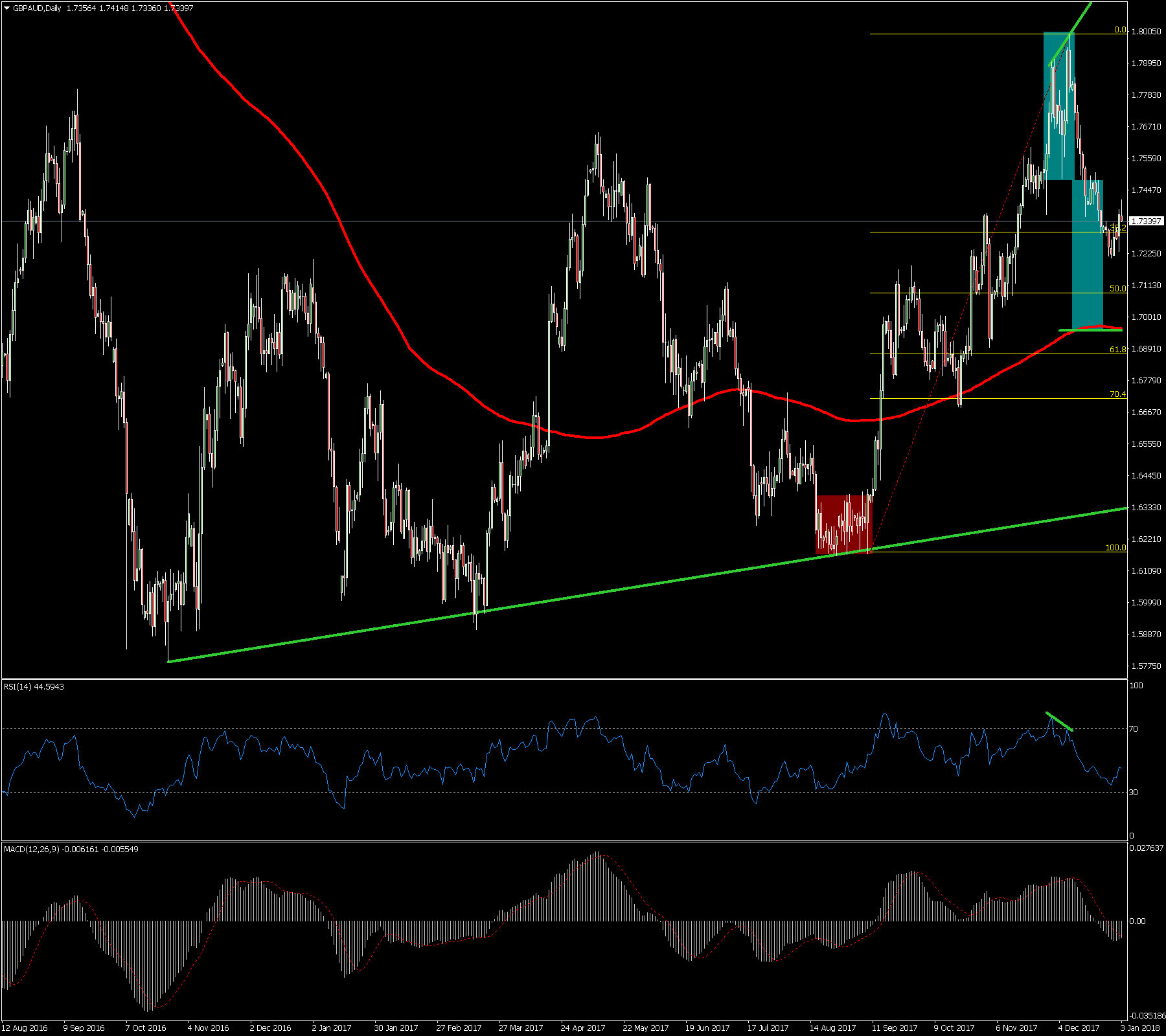 El pasado 30 de noviembre del 2017 el cruce rompió la resistencia relevante en la zona de los 1.5270 activando una gran estructura alcista por Fibonacci, tiene un posible objetivo pendiente al alza hacia la zona de los 1.5850, veremos si la acaba cumpliendo en el futuro.