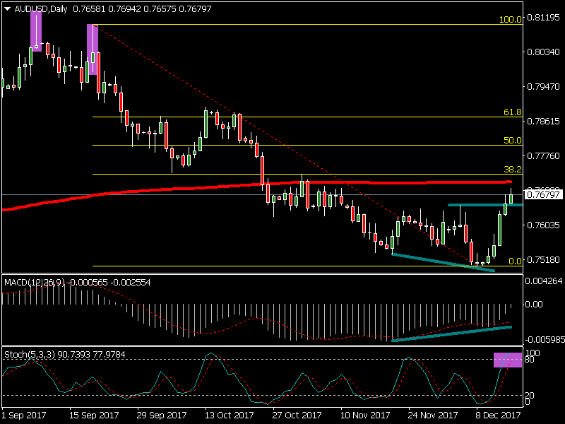 En la sesión de ayer 14 de diciembre del 2017 el AUD/USD rompió la resistencia relevante en 0.7655 activando divergencia alcista con el indicador MACD, vemos cómo el precio forma mínimos decrecientes mientras que en el MACD podemos marcar mínimos crecientes, es una contradicción entre el precio y el oscilador e avisa de posible cambio de tendencia. Tiene un posible objetivo al alza hacia la zona de de los 0.7800 por divergencia, veremos si la cumple o la anula en el futuro. La divergencia sólo se anularía de romper los mínimos de la misma en 0.7500.