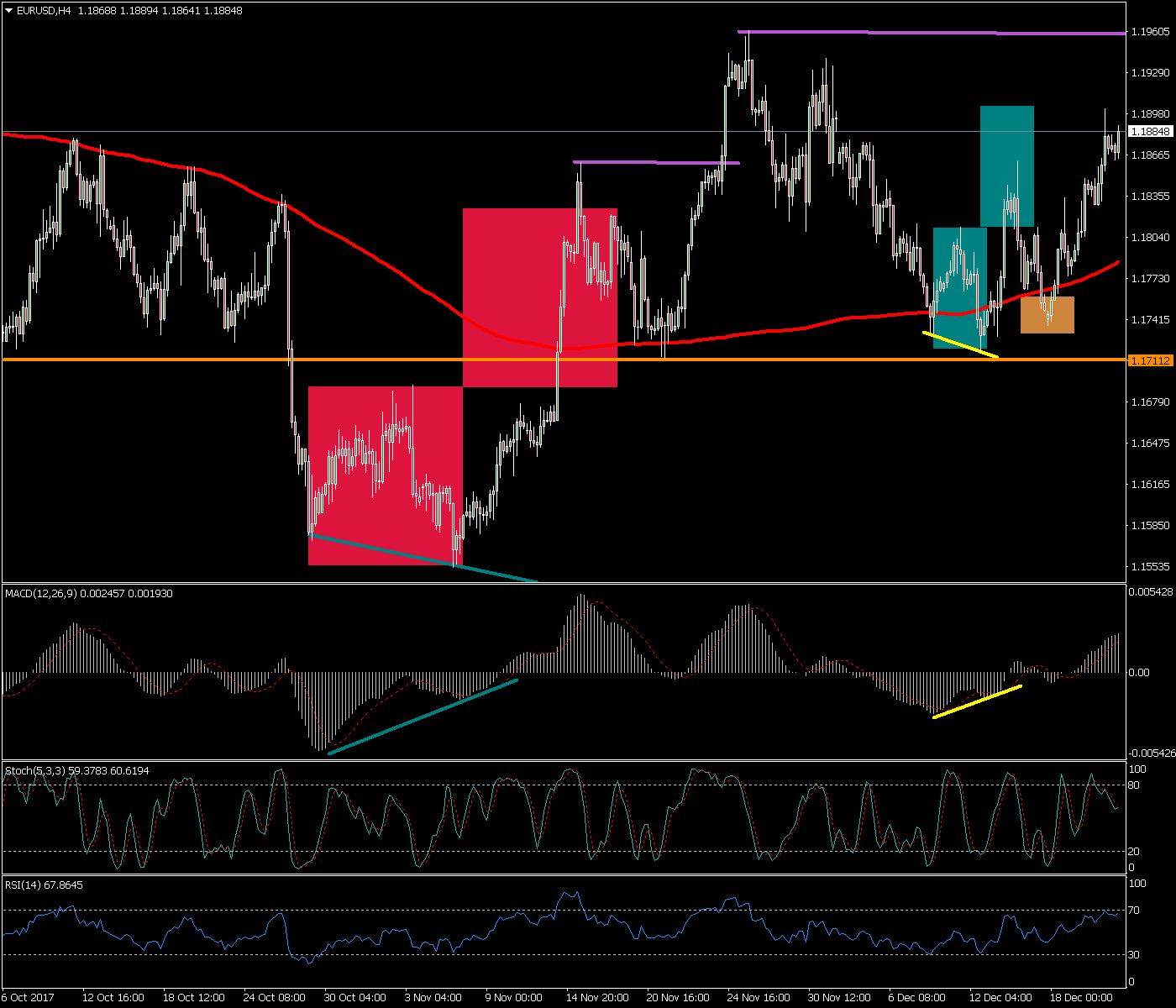 El pasado 13 de diciembre el par rompió la resistencia en 1.1810 activando otra divergencia alcista con el oscilador MACD cómo vemos marcada en color amarillo. Luego el posible objetivo por divergencia alcista sigue pendiente hacia la zona de los 1.1905, muy cerca de cumplirse actualmente.