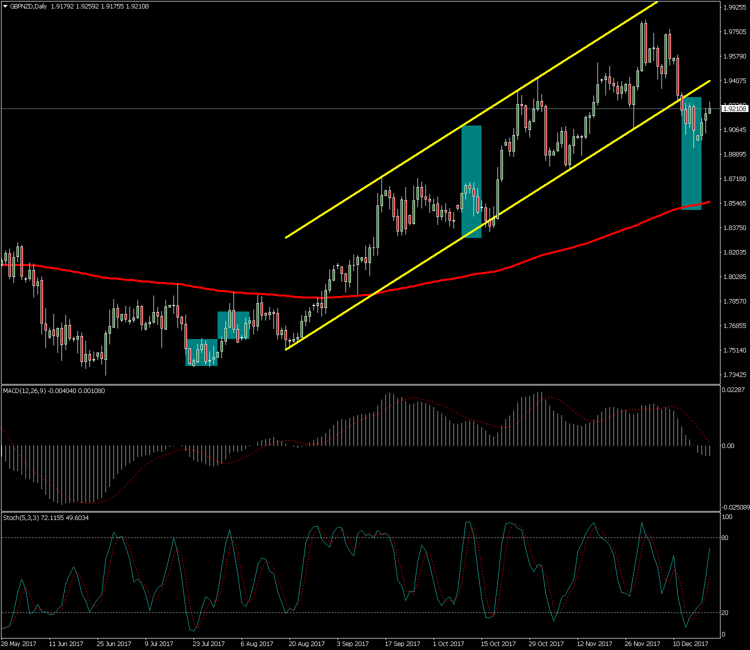 El pasado 12 de diciembre del 2017 el par GBP/NZD rompió el canal alcista a la baja marcado en color amarillo activando un posible objetivo hacia la zona de los 1.8500, veremos si lo acaba cumpliendo en el futuro. El canal sólo se anularía de superar los máximos del pasado 8 de diciembre en 1.9770.