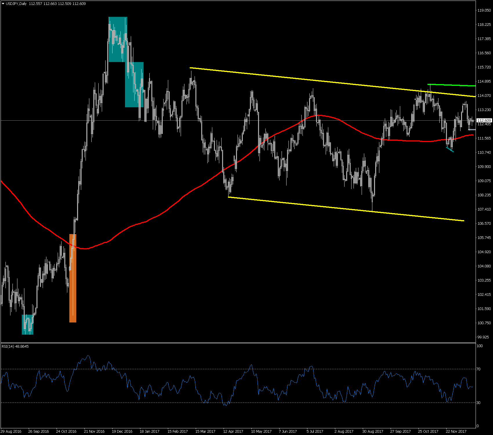 El pasado 9 de noviembre del 2016, el día de las elecciones de EE.UU, el par cumplió la figura tipo doble suelo y acabó formando una gran vela de señal con sombra inferior alargada tipo hombre colgando señalada en color naranja, indicando cierto soporte en los mínimos de la misma.