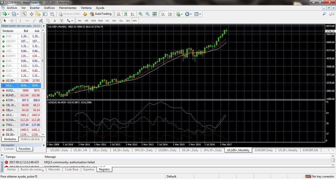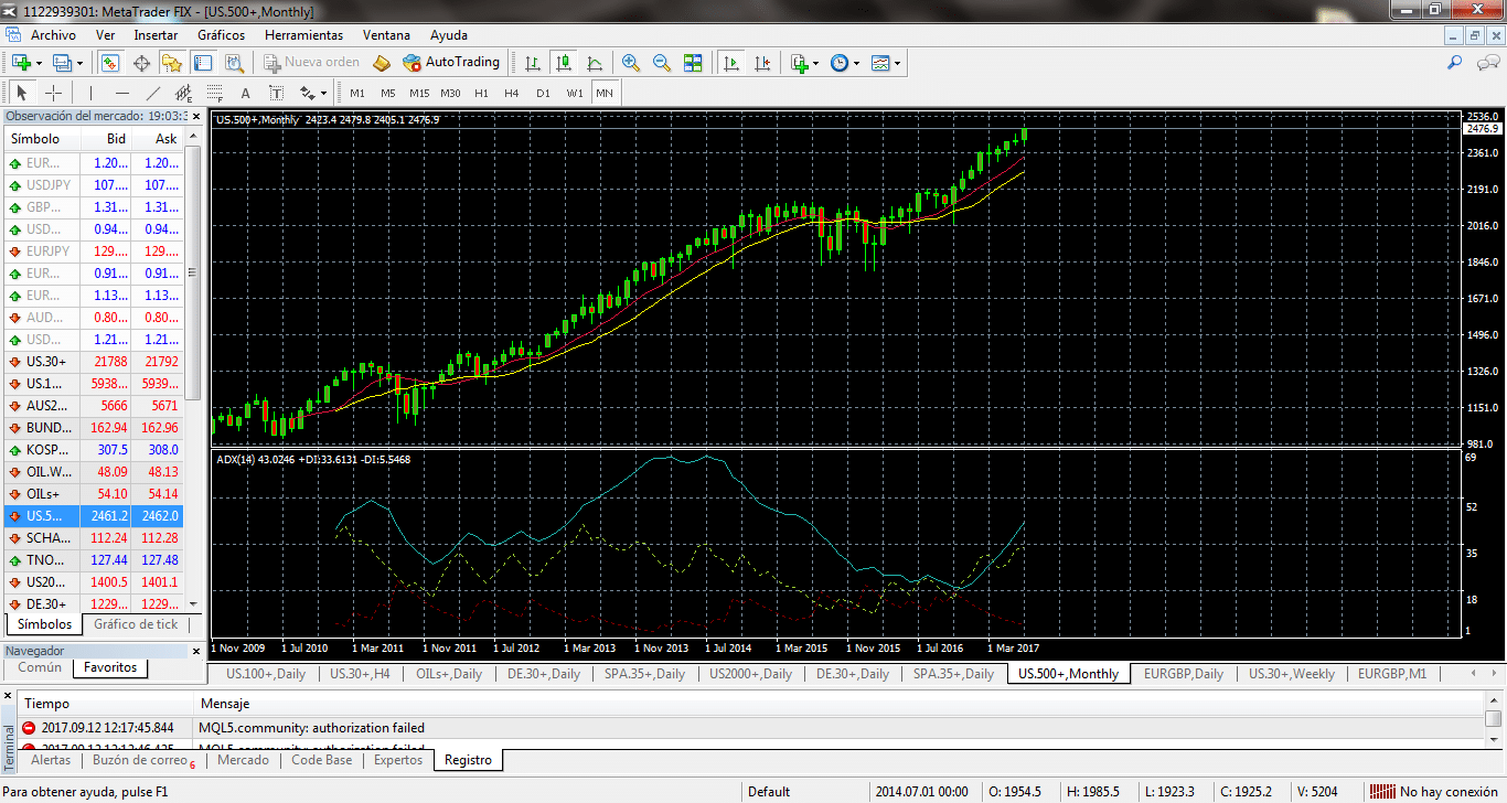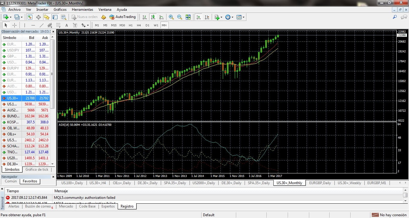 Si echamos un vistazo a los Charts MENSUALES para ver el vigor de la tendencia (me decanto por el Chart MN por que es una tendencia de largo plazo que tiene a los índices en máximos históricos de cotización y mínimos, de los diez últimos años, en cuanto a Volatilidad ), vemos con claridad la subida con las MA’S 9/14 escoltando a las velas; ni siquiera es necesario trazar la Directriz alcista. Además , el ADX ( Oscilador seguidor de Tendencias ) confirma lo que vemos en el Chart.