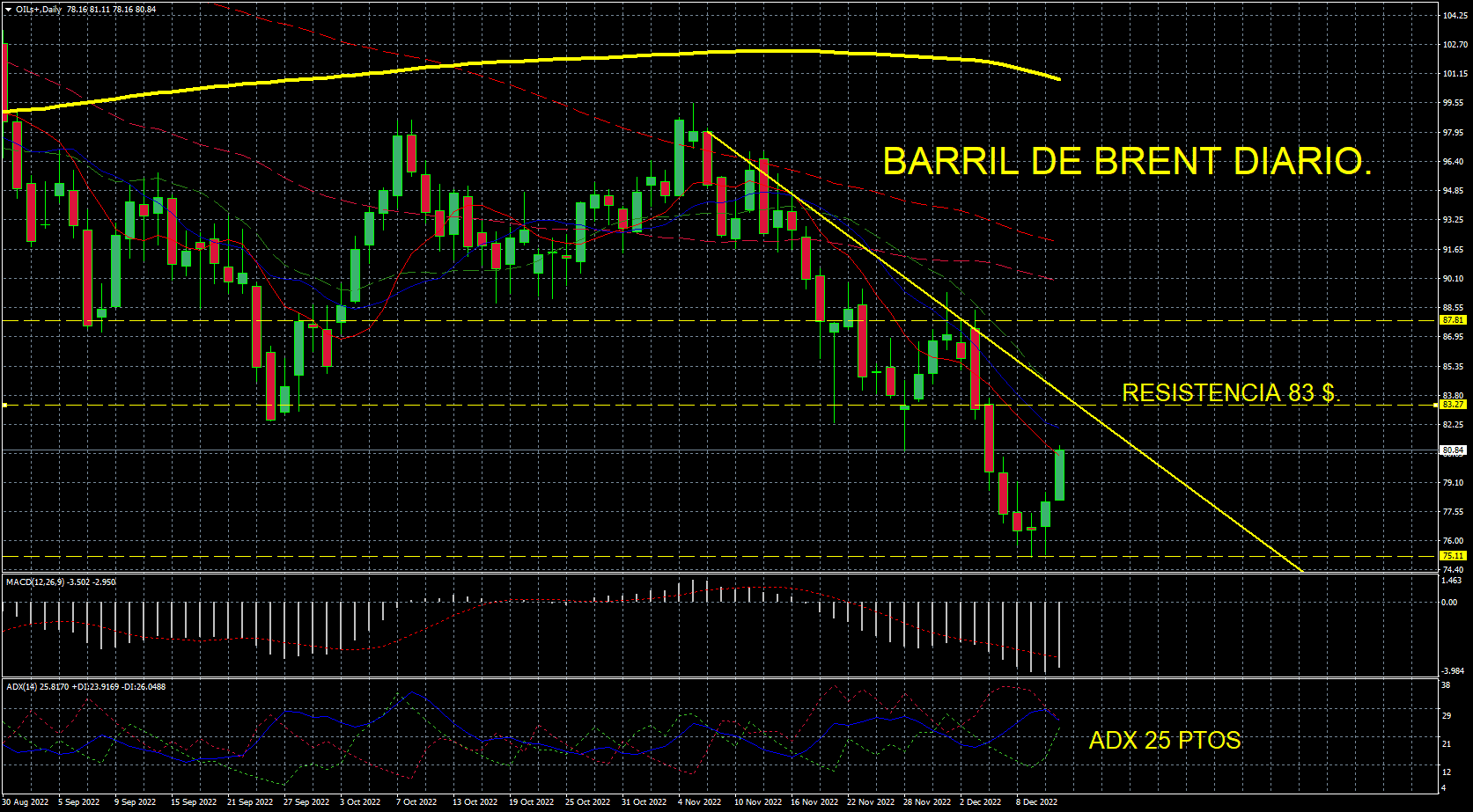 - Si el Barril supera la barrera psicológica de los 80 $, en esta zona testará la Resistencia formada por la mencionada directriz, si la supera (consolidando soporte por encima de 83 $) la trend bajista iniciada en noviembre cesaría.