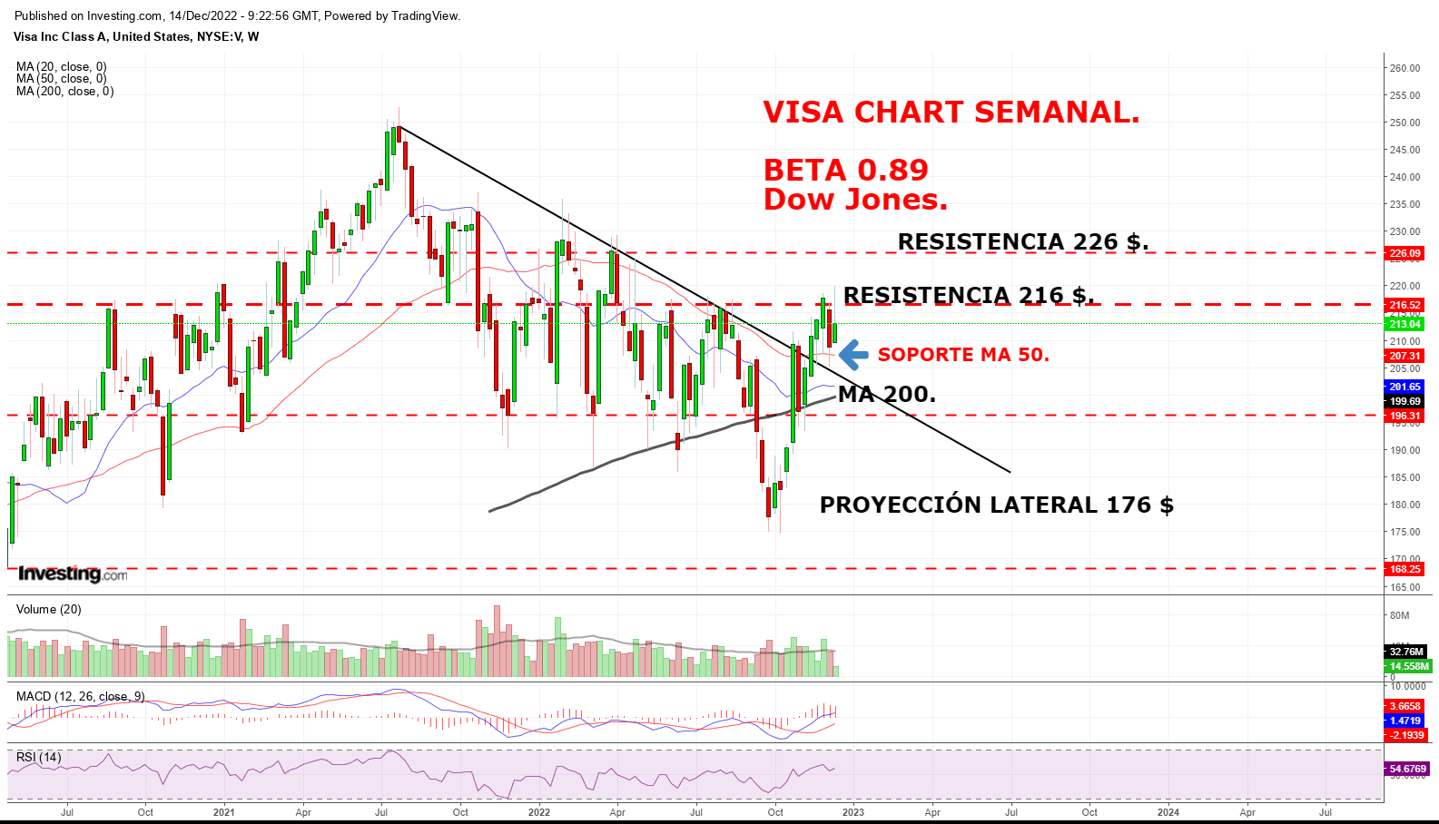 La semana que viene es clave para que V consiga nuevo soporte por encima de 216 $. Si lo consigue, siguiente objetivo, Resistencia 226 $.