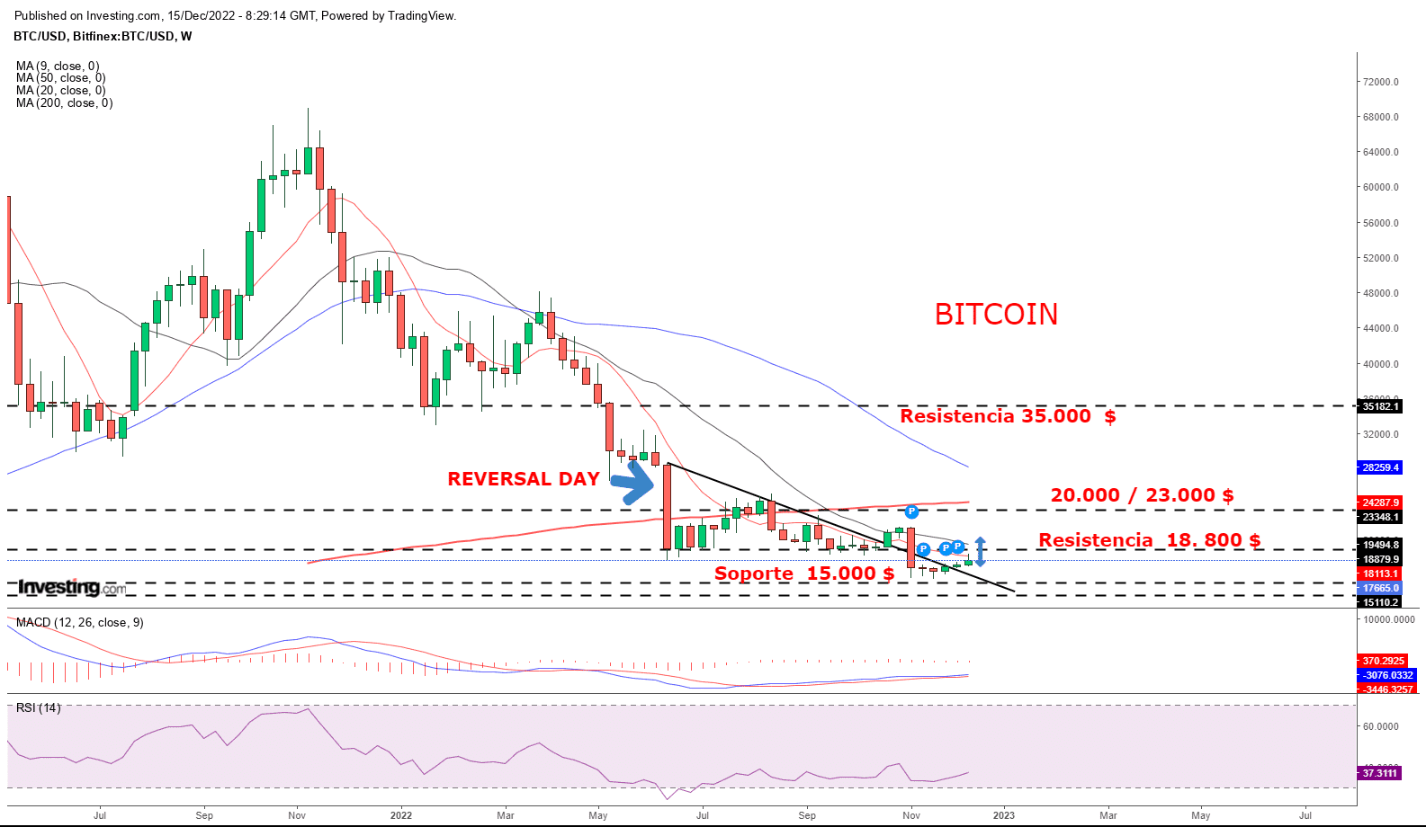 El objetivo sigue siendo Resistencia 18.800 $ , que debería transformar en soporte, y la cota de MA 50 Semanas como nuevo soporte con el fin de alejar el peligro de nueva aceleración de trend bajista.