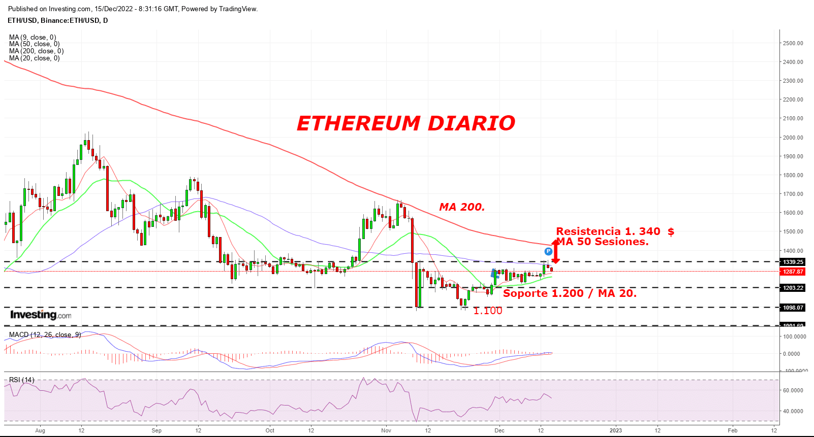 Ethereum rechazó Resistencia MA 50 sesiones y cae hacia soporte MA 20.