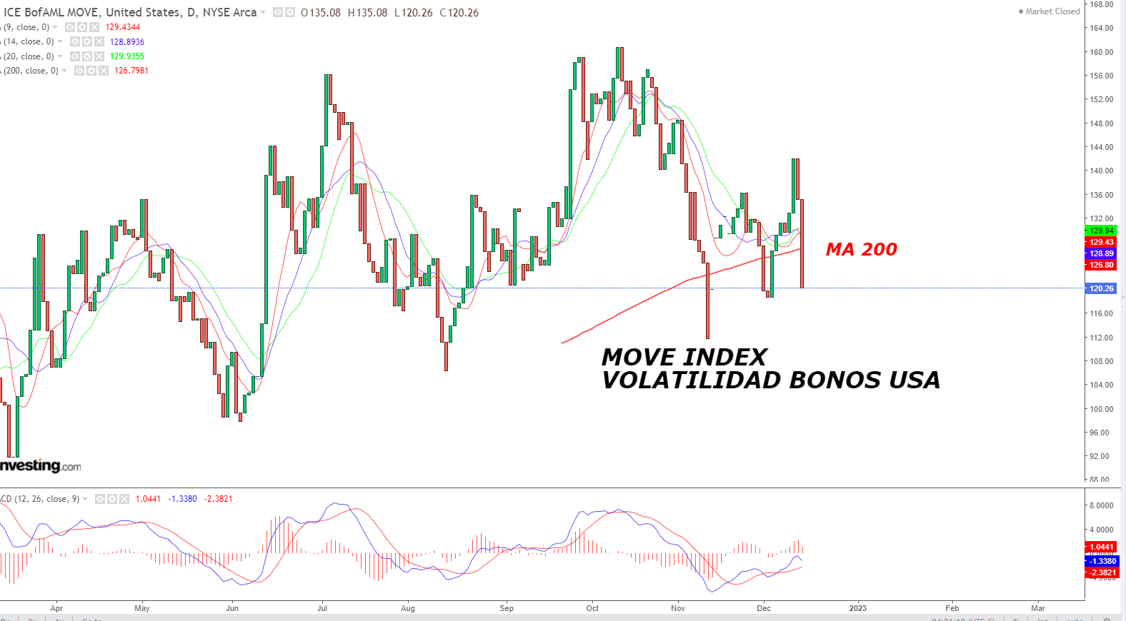 Para el rally de Navidad que esperamos, cumplida la primera condición que era bajada de inflación, necesitamos consolidar la bajada de volatilidad en el MOVE (volatilidad Bonos) y consolidar ruptura por encima de 4.100 ptos; por debajo de esa cota el S&P seguirá atrapado por la resistencia de la directriz bajista.