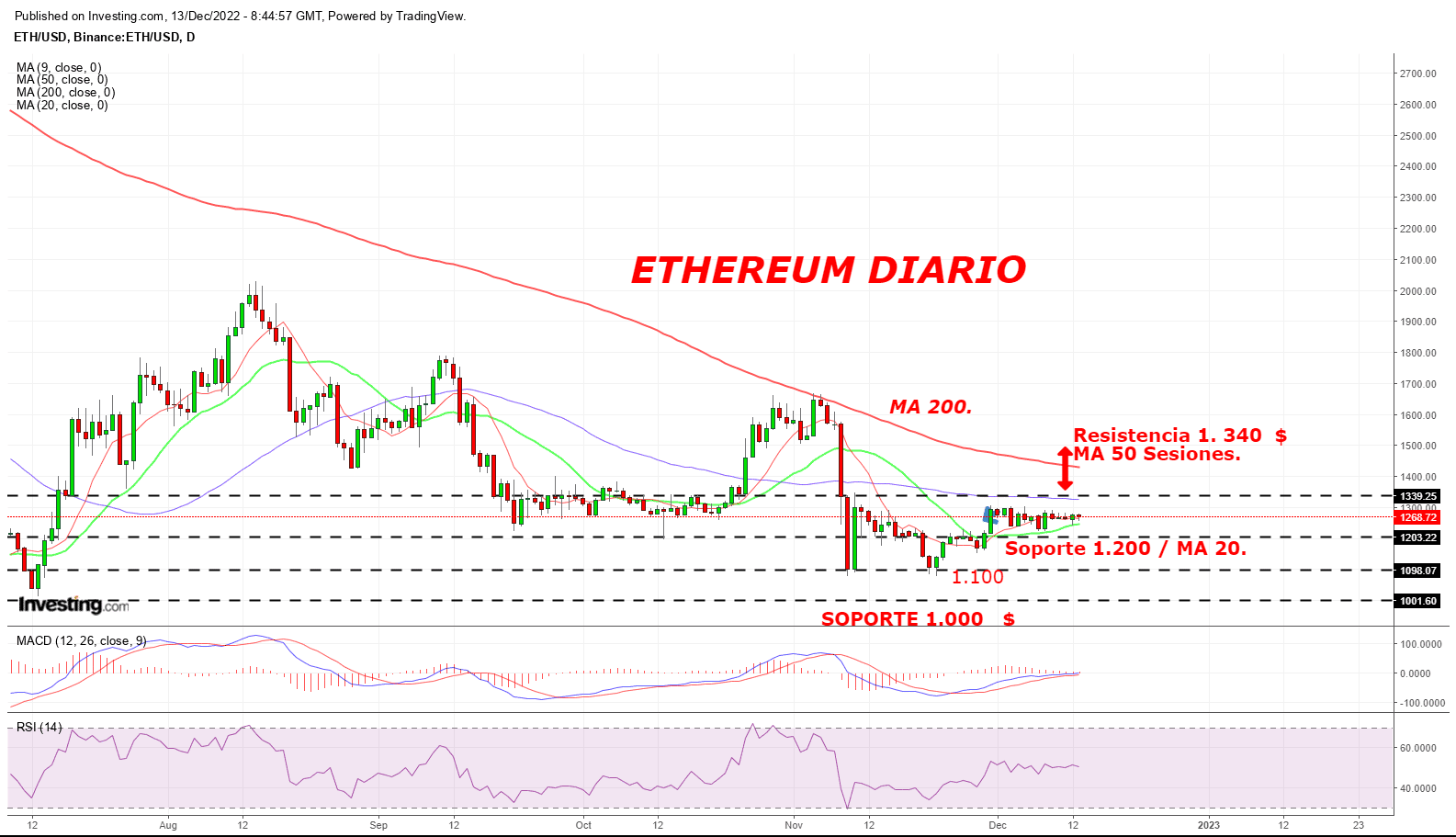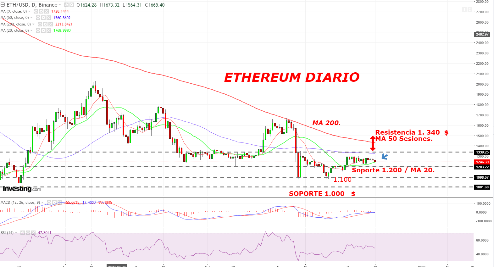 Ethereum sigue lateral en Diario con velas de escaso rango. Ha conseguido, durante dos semanas, mantener soporte en MA 20.El objetivo continua siendo MA 50.