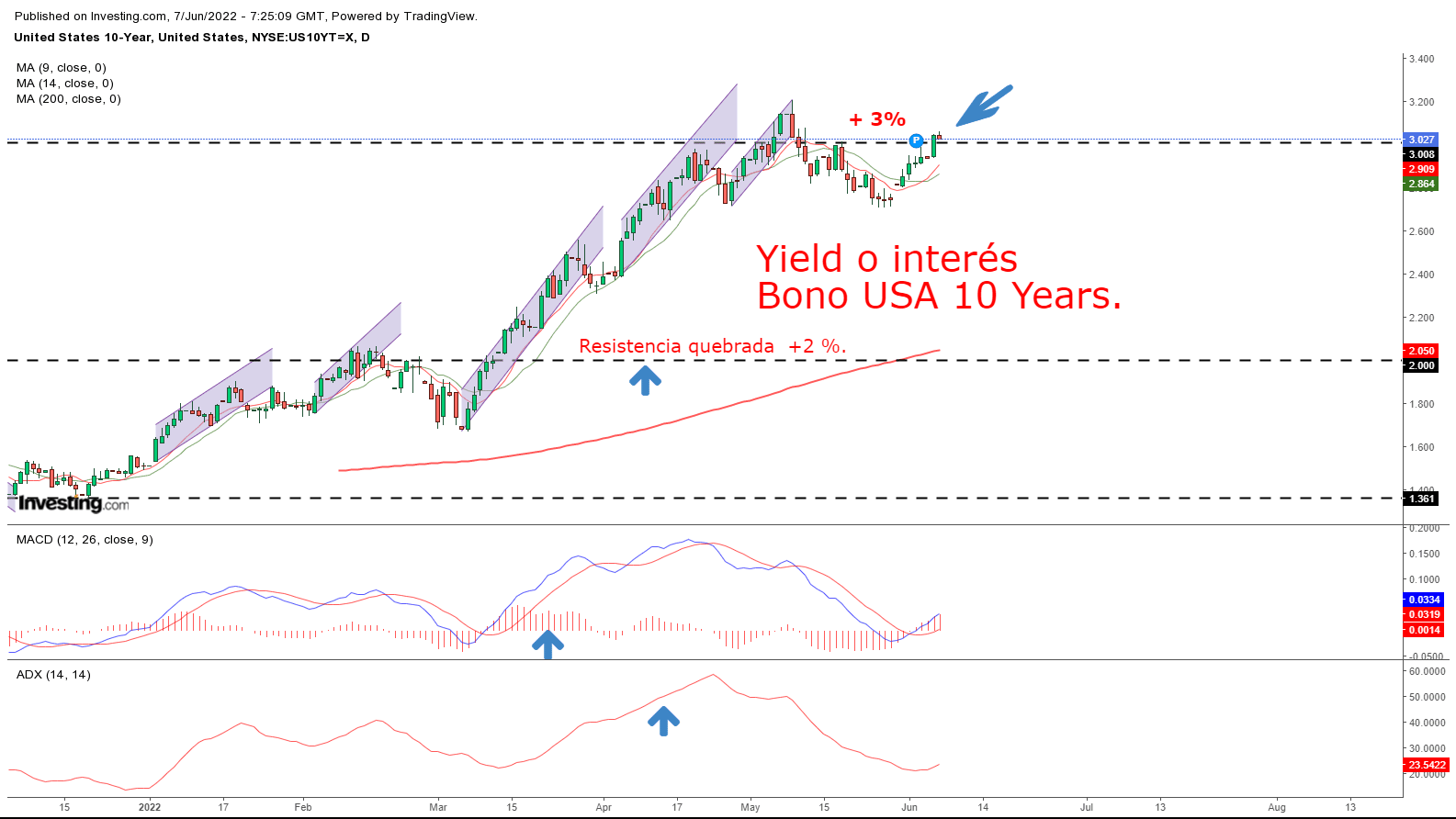 La última vez que tuvimos al Bond 10 years de referencia por encima de + 3% hubo sell off de acciones. No tiene porqué repetirse ya que la actualización de carteras de mayo ya pasó y el mercado mira ahora hacia el tercer viernes de junio con vencimiento trimestral de derivados; pero la tensión en las carteras 60 / 40 ( 60 % renta variable 40 % renta fija – o viceversa – ) puede volver durante esta semana.