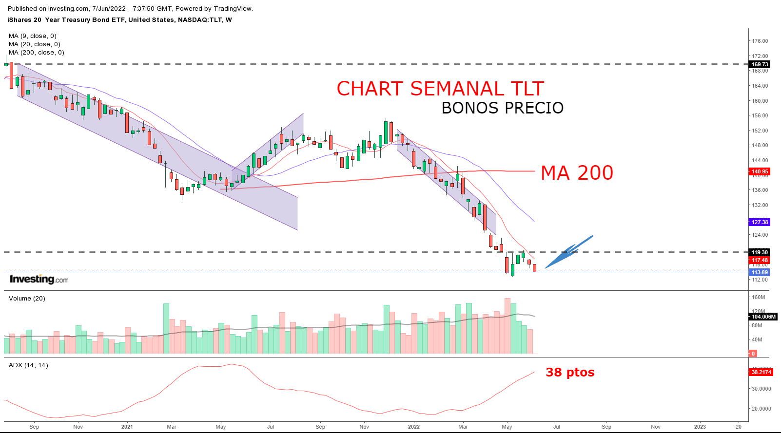 Para el caso de los Bonos con vencimiento superior a 20 años ( I shares TLT ETF) la situación de aumento de rendimiento y caída de precios es todavía mayor.