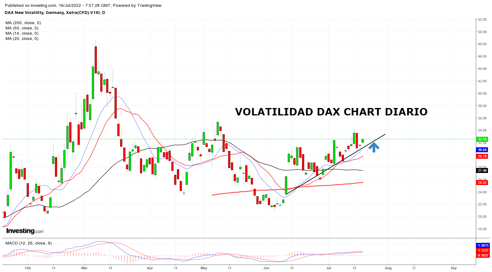 La volatilidad del DE 40 se presenta alcista en trend en Diario; con un mal dato de inflación podríamos ver una aceleración alcista.