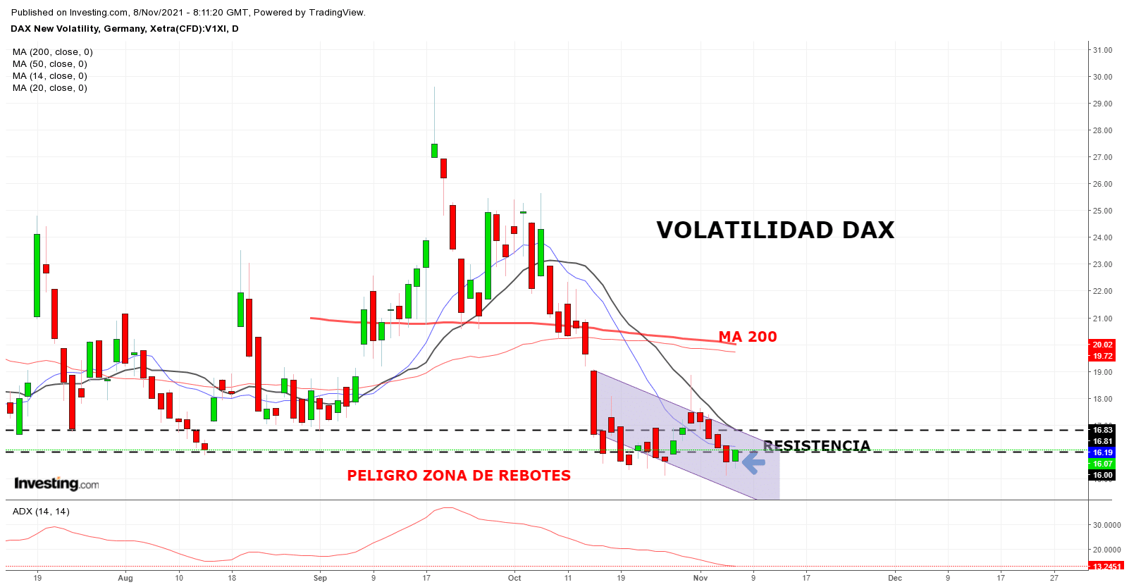 La clave puede estar en el índice de volatilidad del DAX que se presenta en zona clave. O alcista y ataca la resistencia del canal – malo para los largos en DAX – o bajista y testa a la baja el soporte del canal de volatilidad. Esta sería la mejor opción para una sesión con posibilidades de largos que consoliden máximos históricos. Objetivo mínimo para DAX, buscar Soporte en 16.100 ptos.