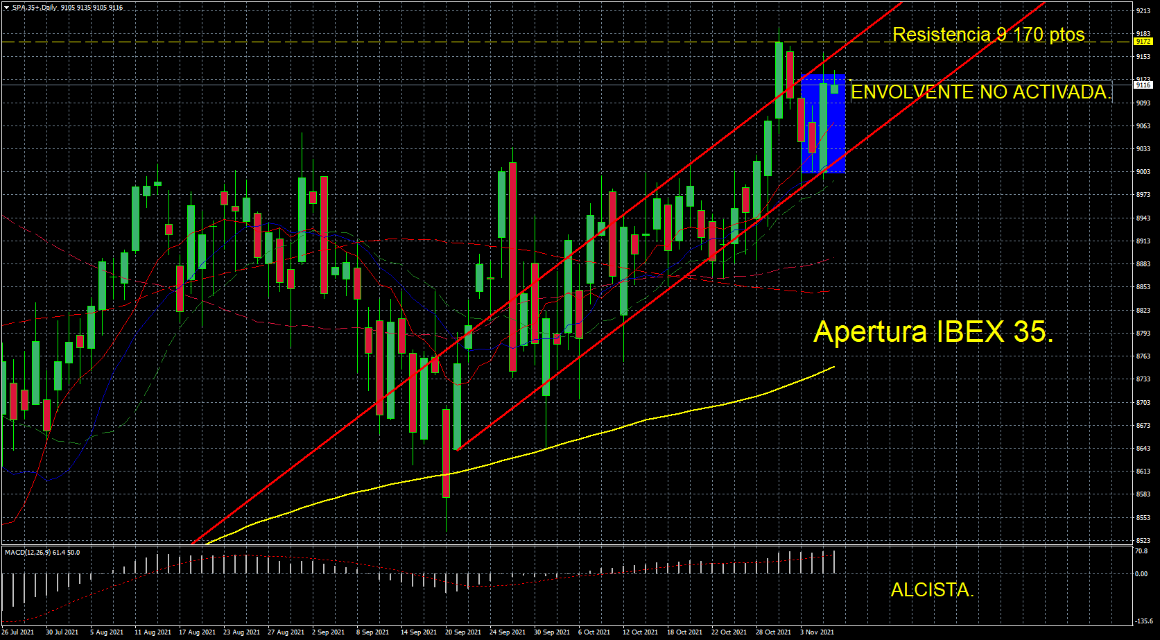 El IBEX 35, abre con malas noticias técnicas; ya que presenta una envolvente alcista NO activada. Resistencia 9.170 ptos, recorrido a 9.230 ptos y recorrido máximo de largos a Resistencia en 9.370 ptos. Esta última cotización será la Resistencia mayor de IBEX para largos ya que la testó en diciembre de 2019, para caer posteriormente en dos meses consecutivos a 6 685 ptos .
