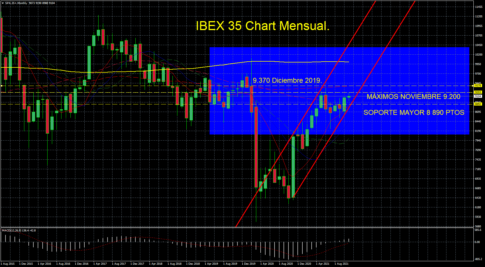 En el siguiente gráfico IBEX Mensual podemos ver la Resistencia mayor 9.370 ptos.