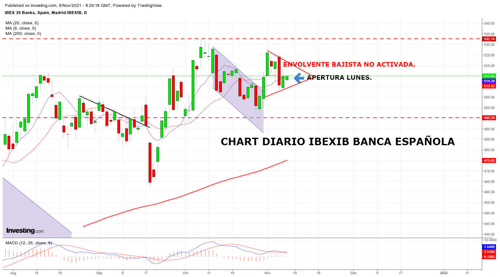 Por último, respecto al sectorial bancario, tras dejar atrás el peligro de una envolvente bajista, seguimos con mucha atención la evolución del cono en Diario. Una ruptura alcista en el sector sería todo lo que necesita el IBEX para ir a zonas de resistencia mayor ( consolidarlas sería más difícil) antes mencionadas.
