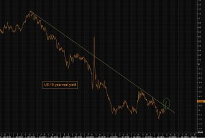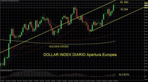 El billete verde se sitúa en zona de ruptura, hoy durante la apertura de Europa, con un Doji pero, de confirmación de ruptura al fin y al cabo. Esta vez la ruptura cuenta con un aliado de lujo sobre el que ya hemos tratado en este Blog; el “Golden cross”. Es decir el cruce alcista de la MA de 50 Sesiones por encima de la MA 200. Esta circunstancia de mercado no significa una escalada asegurada, hoy o mañana pero sí nos dice – el mercado – que los soportes mayores se van a ver muy reforzados y, además, si el Dólar, como ayer, cuenta con la ayuda del la Secretaria del Treasury EEUU Janet Yellen – ex Gobernadora de la FED – declarando que “estaría muy preocupada si los inversores dejasen de ver al Dólar como refugio valor” , más posibilidades de ruptura alcista del Dollar Index en un contexto de oro presionado a la baja por la escalada de la yield del US 10 Years Bond.