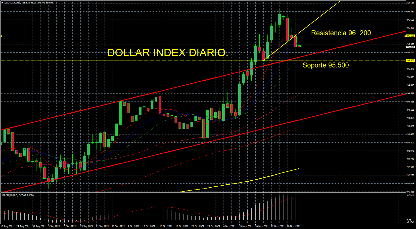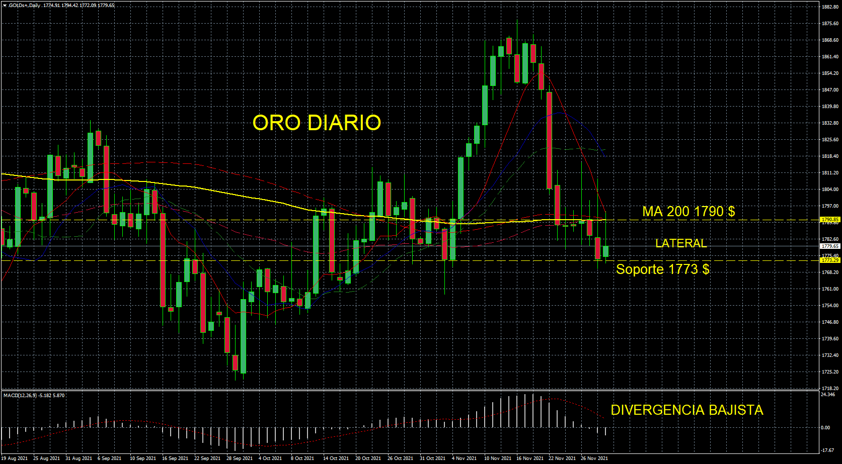 Si se pierde a la baja, presión bajista para el oro que se encuentra en lateral (siguiente gráfico) y alcista para el Dólar. Si por el contrario tenemos subida de precios del Bono y vemos rebote alcista entonces, largos en Oro que irá a buscar 1790 $ t cortos en Dólar que presenta su soporte mayor en 95. 500.