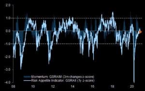 El trazo azul claro del indicador de abajo “apetito por el riesgo” del mercado. Indicador de JP Morgan. A pesar de haber buen momentum no hay ganas de entrar. El análisis de este banco de inversión sugiere que el mercado – es decir los inversores – lógicamente están a la espera de tomar una dirección. En términos de análisis técnico se podría resumir, observando los diarios de S&P y Nasdaq, que hay que decidir si se activa el patrón bajista de doble techo o por contra, prosigue el rebote previo a las elecciones y se acaba formando un patrón contrario (alcista) de doble suelo.