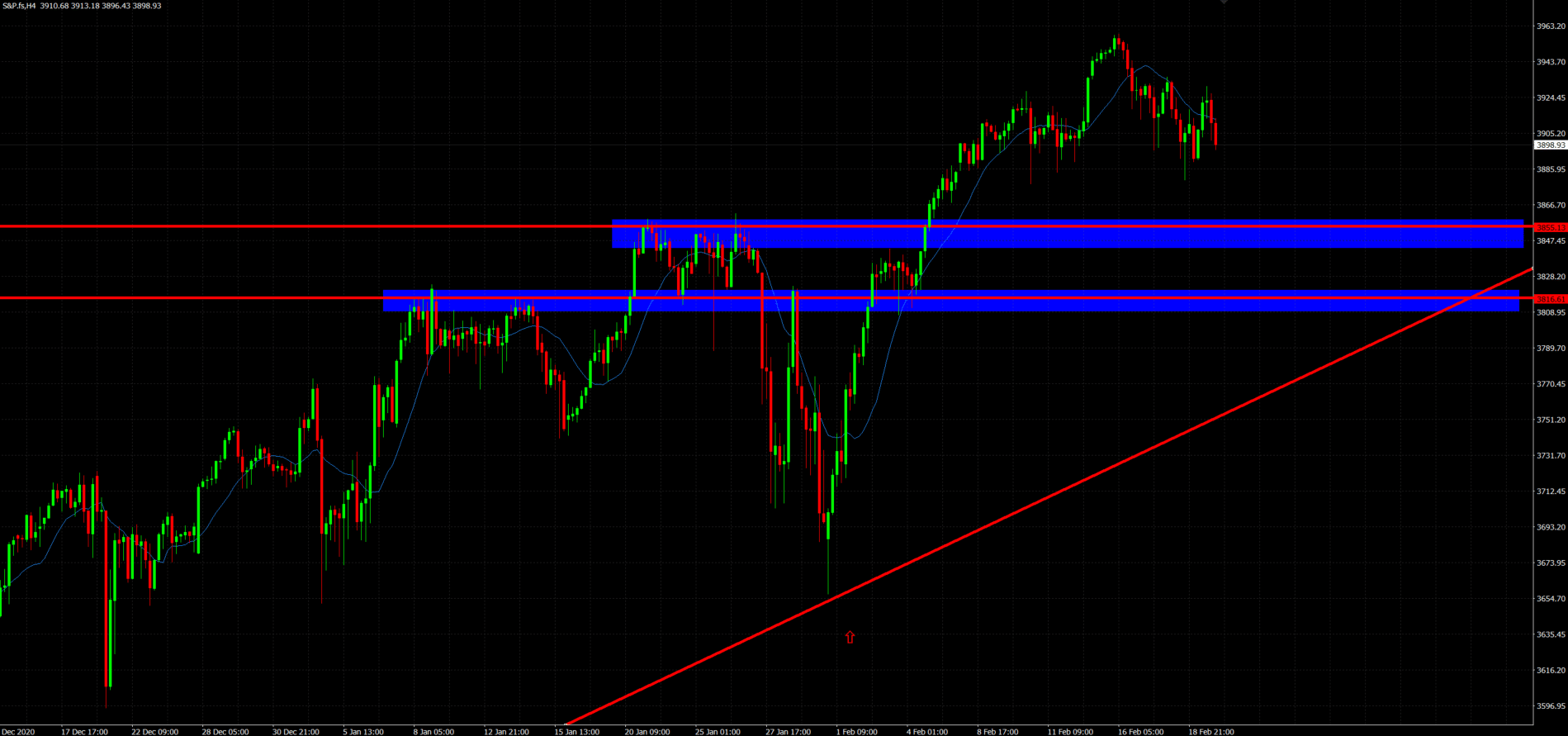 Dichas zonas en los niveles de 3.855 puntos y 3.810 puntos (es decir entre los 3.850 y los 3.800) pueden actuar efectivamente como Throw Back (término que hemos tocado en anteriores análisis y en las sesiones del Club del Trader) para seguir buscando proyecciones alcistas y cumplir el objetivo semanal de vela envolvente.