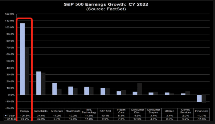 En el siguiente gráfico vemos quién ha sido el “king of earnings growth” de los beneficios en la última ronda de presentación de resultados en las empresas del S&P 500. Energía.